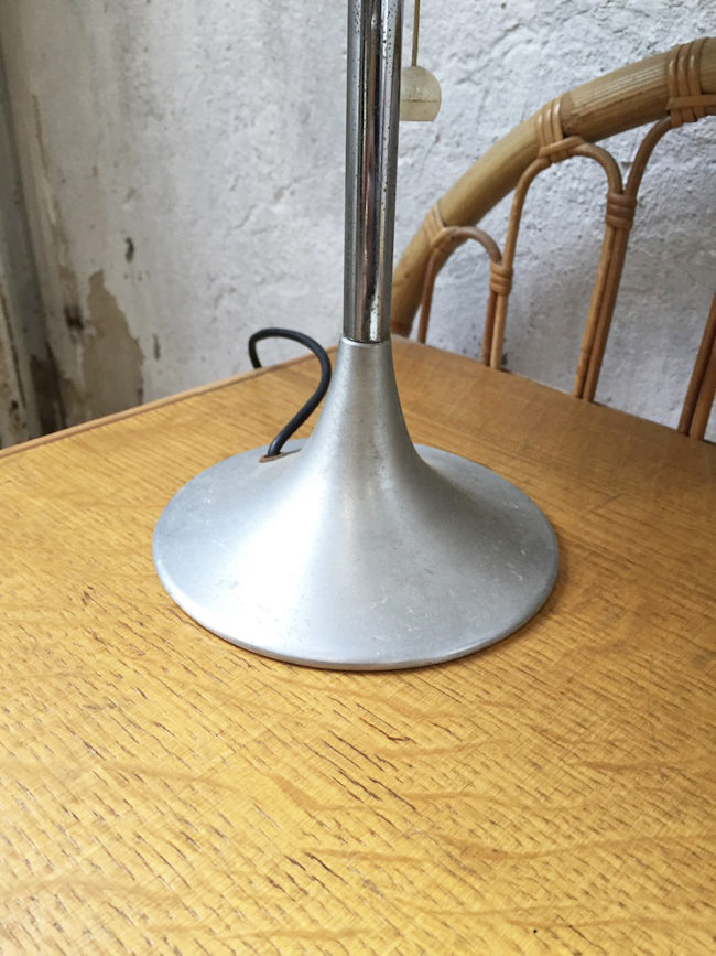 Cette lampe est en aluminium brossé, avec un piétement tulipe.