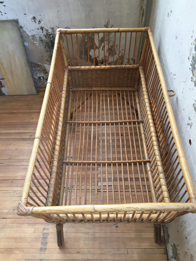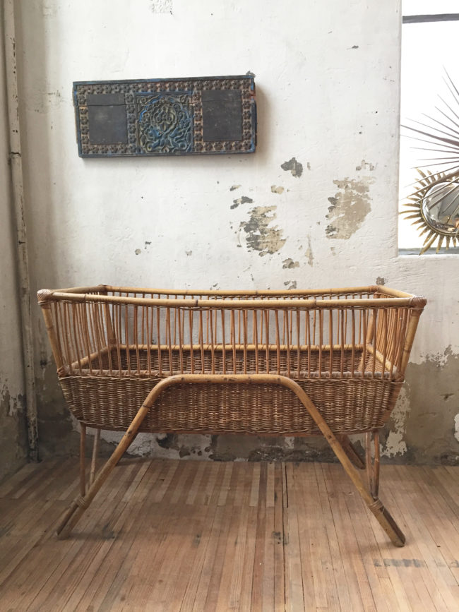 Sympathique petit lit vintage en osier tressé et rotin. Avec ses dimensions généreuses, il accompagnera longtemps votre bébé.