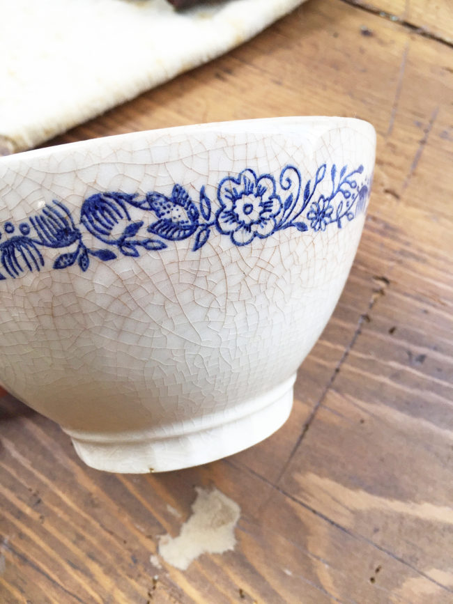 Anciens bols en faïence avec des motifs bleus fleuris.