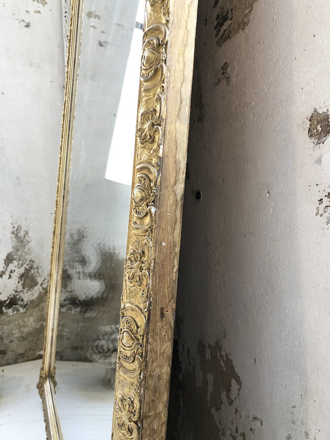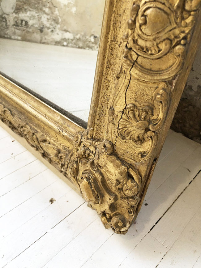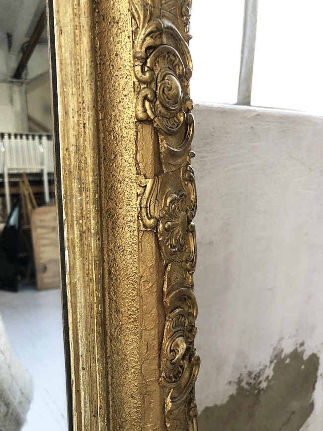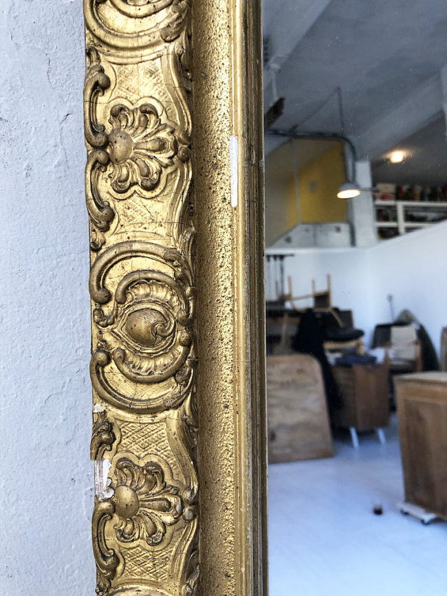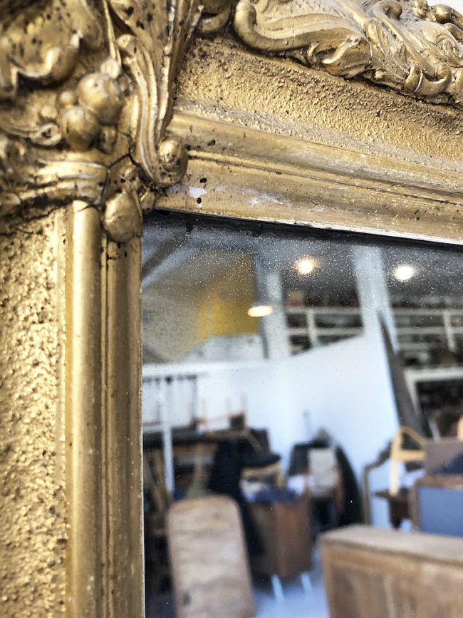 La glace au mercure est légèrement piquée par endroits, on perçoit le bel effet pailleté sur ses bords.