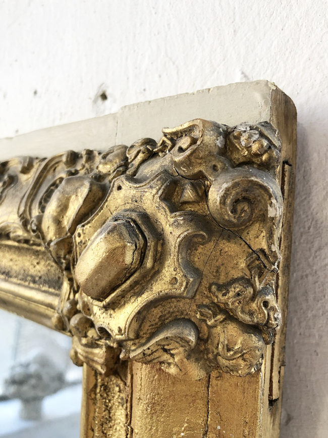 Jolis décors fleuris sur le cadre. Le cadre a eu des manques dans le stuc comme l’attestent les photos, mais possède une petite dorure de complément permettant une unité sur l’ensemble.