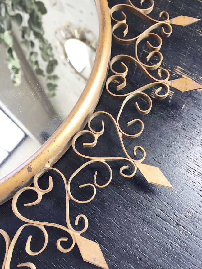 Le miroir possède un encadrement doré dentelé.