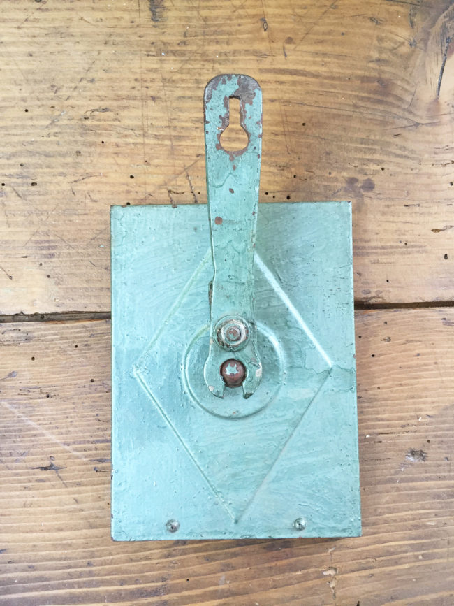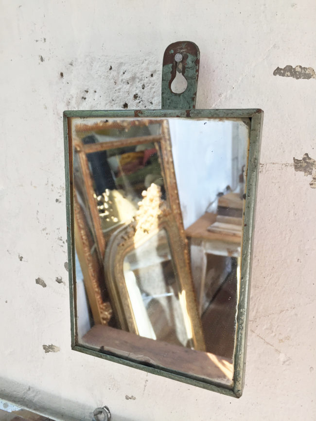 Ancien petit miroir de barbier rectangulaire, avec son cadre en métal patiné vert.