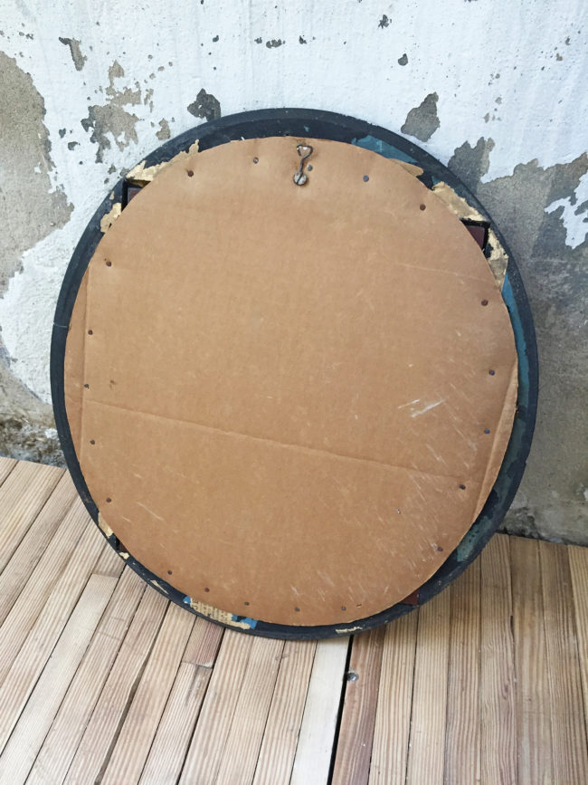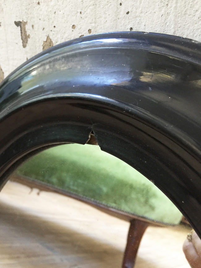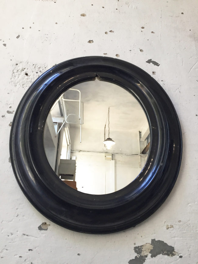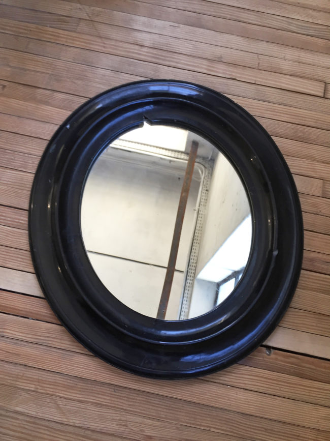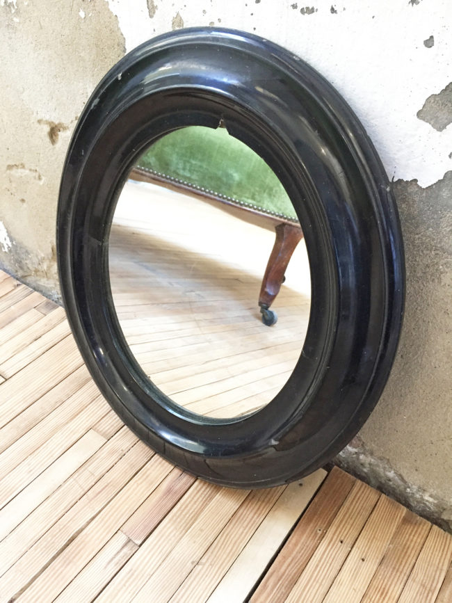 Le miroir possède un encadrement en bois sculpté et résine noircie.