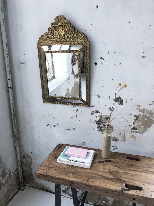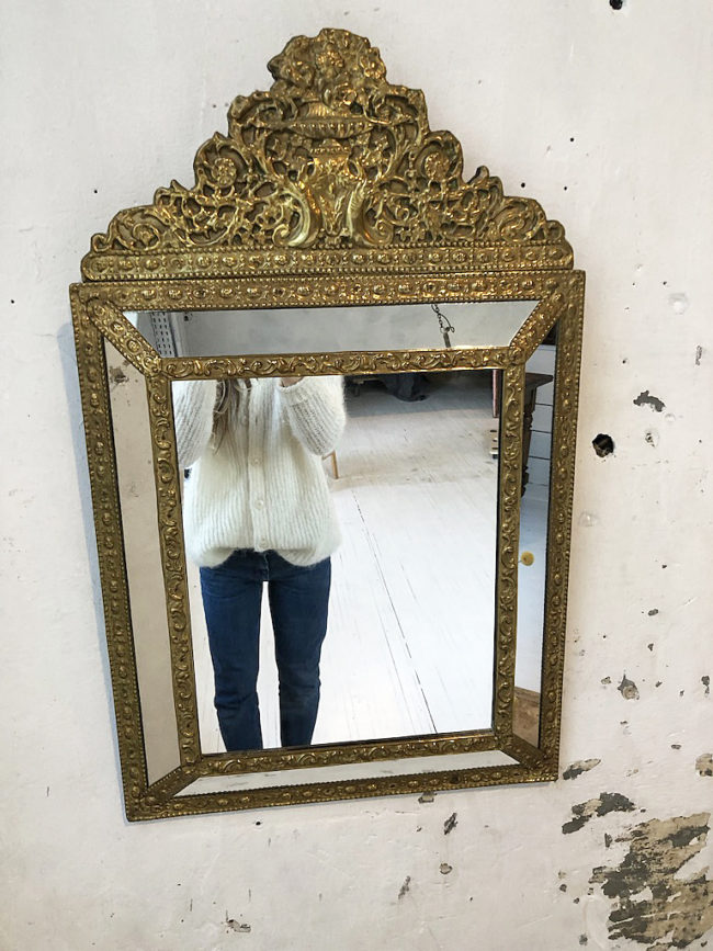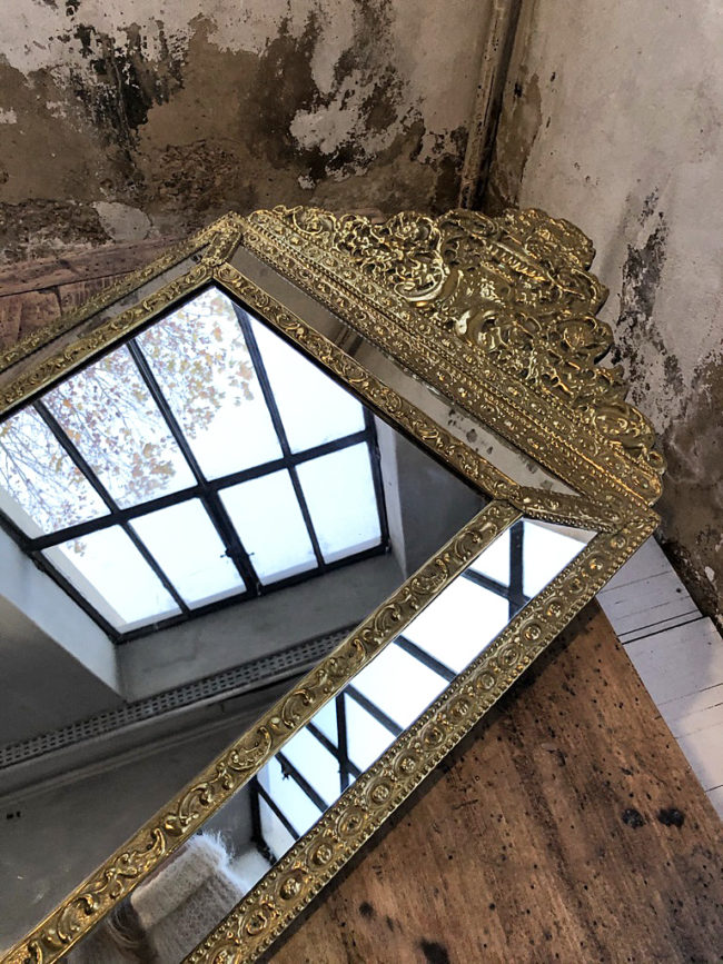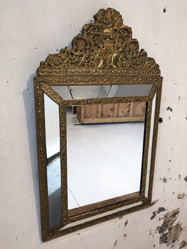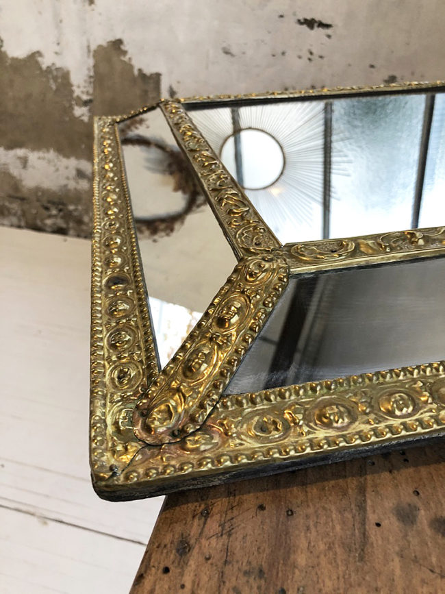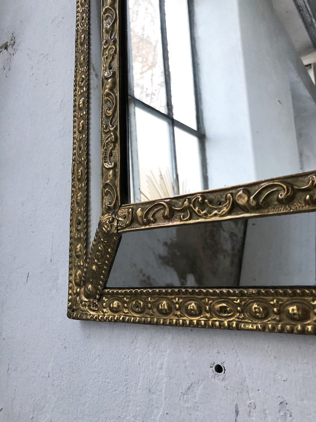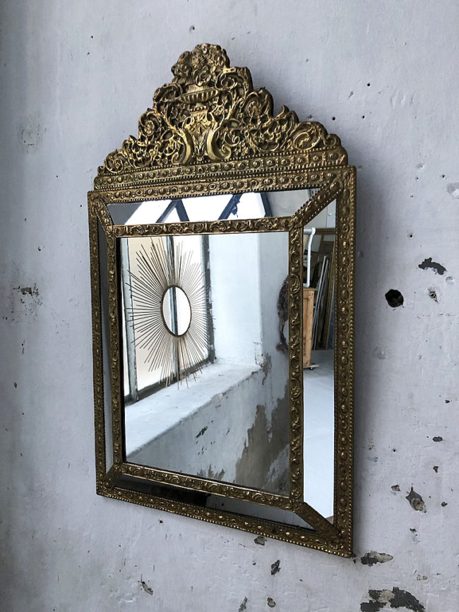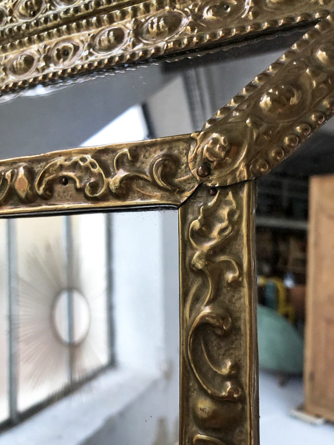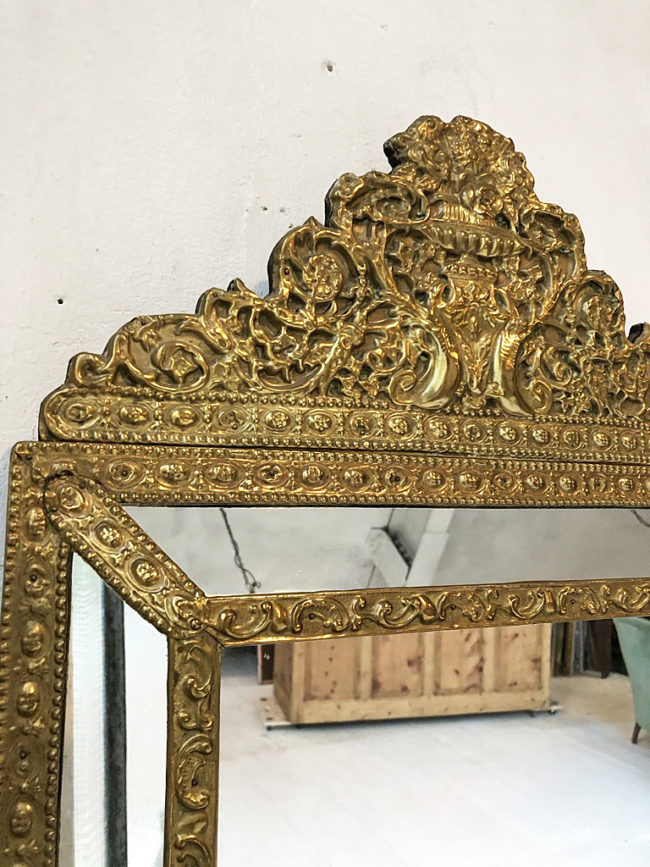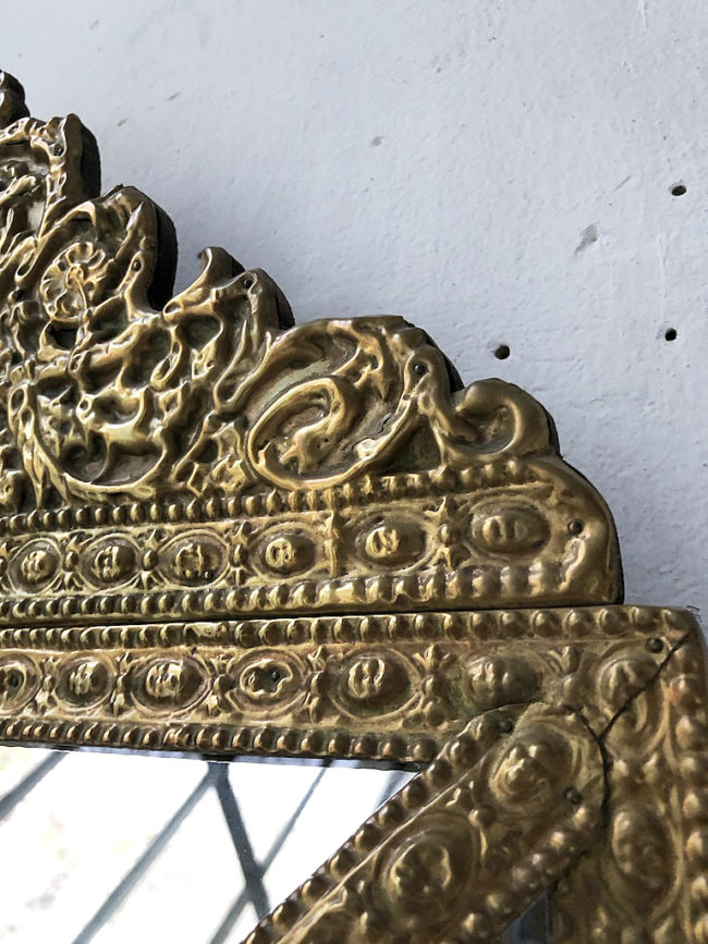 Ancien miroir à parcloses en laiton repoussé d’époque Napoléon III.