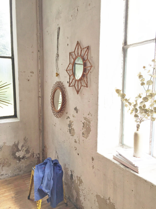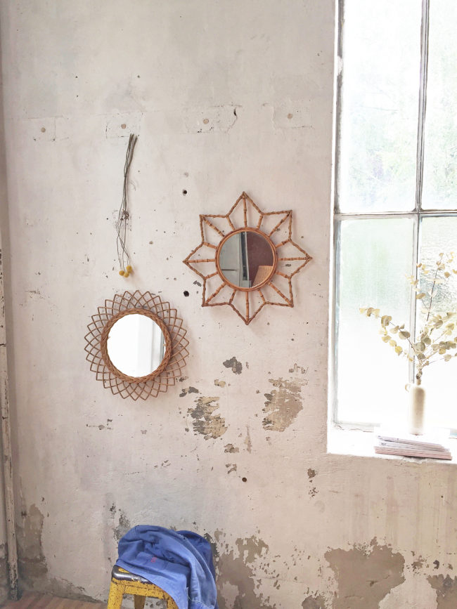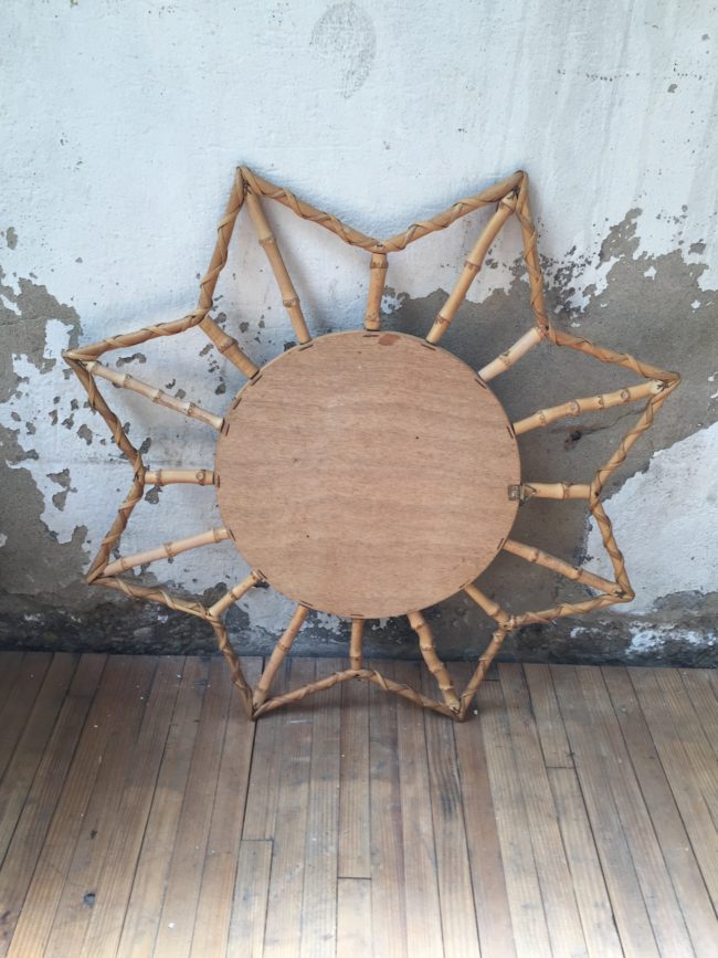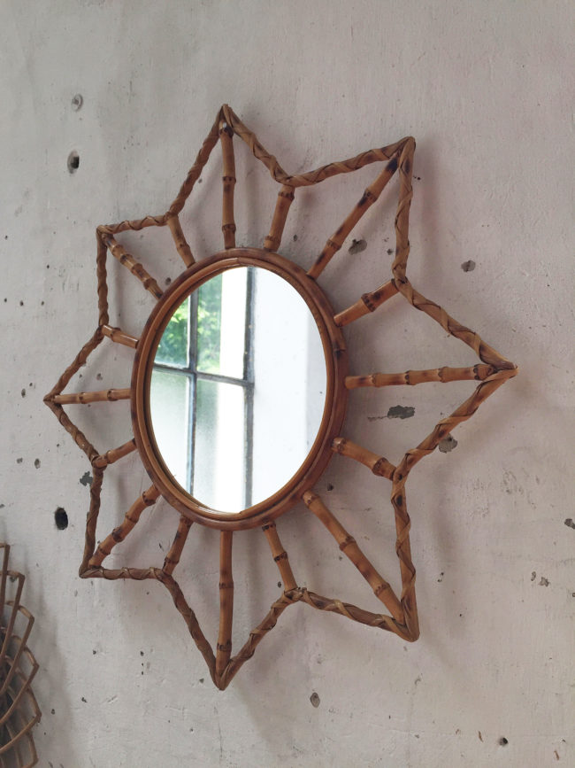 Deux miroirs sont disponibles, un miroir rosace en rotin et osier ainsi qu’un miroir en rotin en forme d’étoile peu commun.
