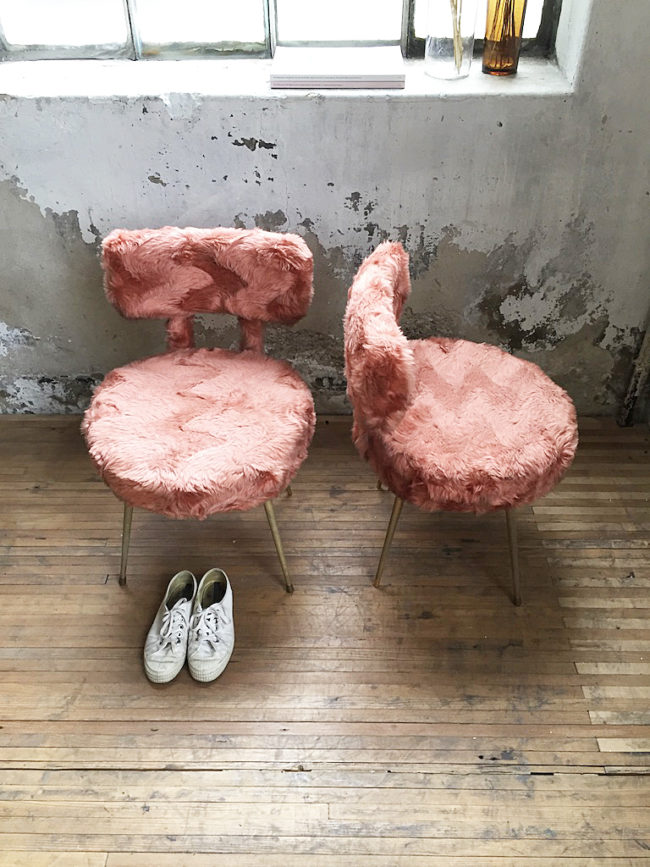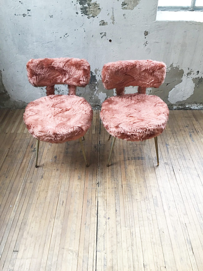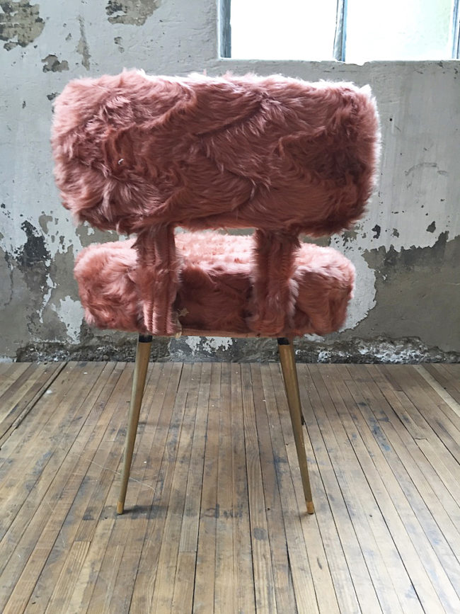Chaise modèle Pelfran en moumoute rose. Piètement fuselé en métal laitonné, assise et dossier déhoussable facilement passable en machine. Mousse en bon état, tissu en très bon état. Une vraie touche rétro pour votre intérieur ! Deux chaises disponibles, le prix est pour une chaise.