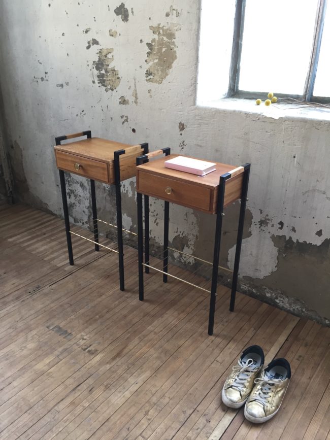 Les tables de nuit possèdent une jolie patine du temps passé, la nuance du bois est un peu différente entre les deux chevets. Leur aspect moderniste se mariera a tout type d’intérieur.