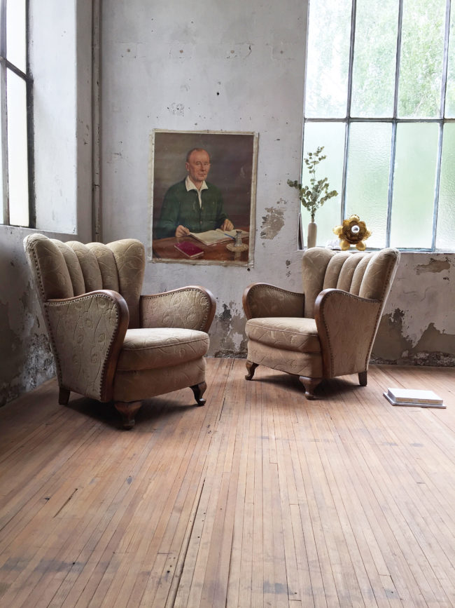 Ces cossus fauteuils des années 30 possèdent un revêtement en velours avec motifs fleuris dans les tons beiges. Ils possèdent des accoudoirs ainsi qu’un piètement en bois. Leur assise est très confortable, et la hauteur de dossier est idéale, même pour les plus grands.