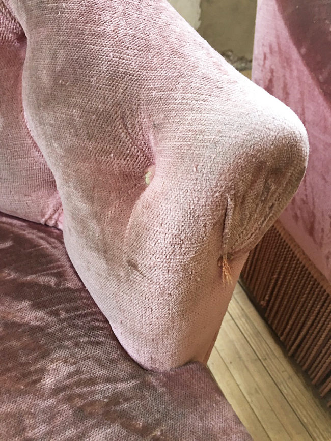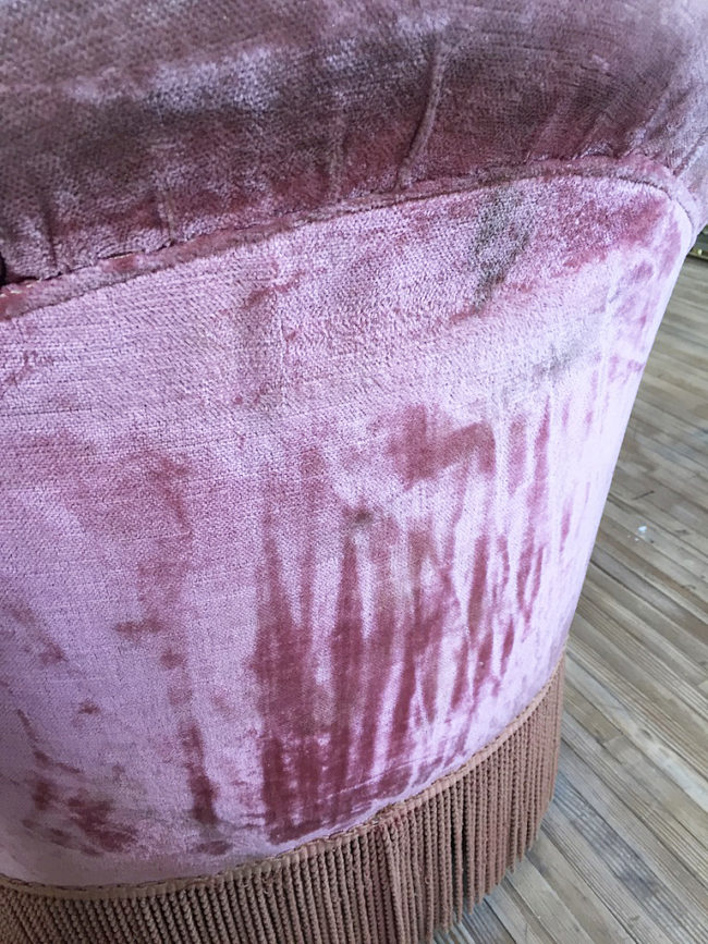 Ces deux fauteuils possèdent un excellent confort d’assise, le tissu quant à lui est ancien et présente quelques signes d’usure – différences de nuances, points de couture visible sous l’accoudoir, ainsi qu’une marque plus foncée sur l’arrière d’un des deux fauteuils.