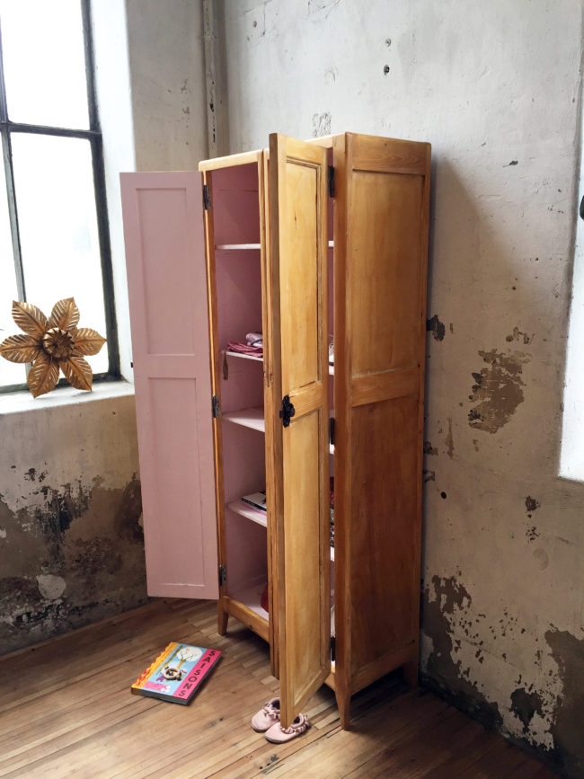 Le vestiaire a été entièrement poncé, puis verni. Quant à lui, l’intérieur peint en rose – mémoire de sa précédente vie – a été conservé.