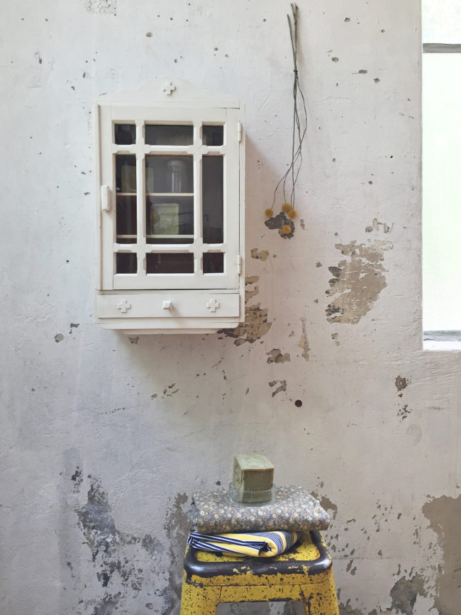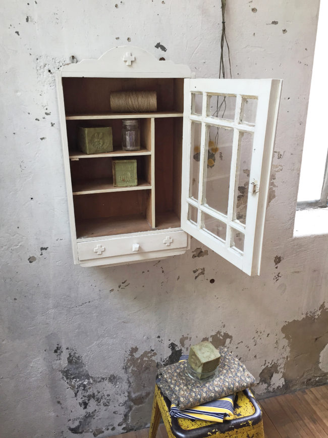 Ancienne petite armoire à pharmacie en bois peint en blanc.