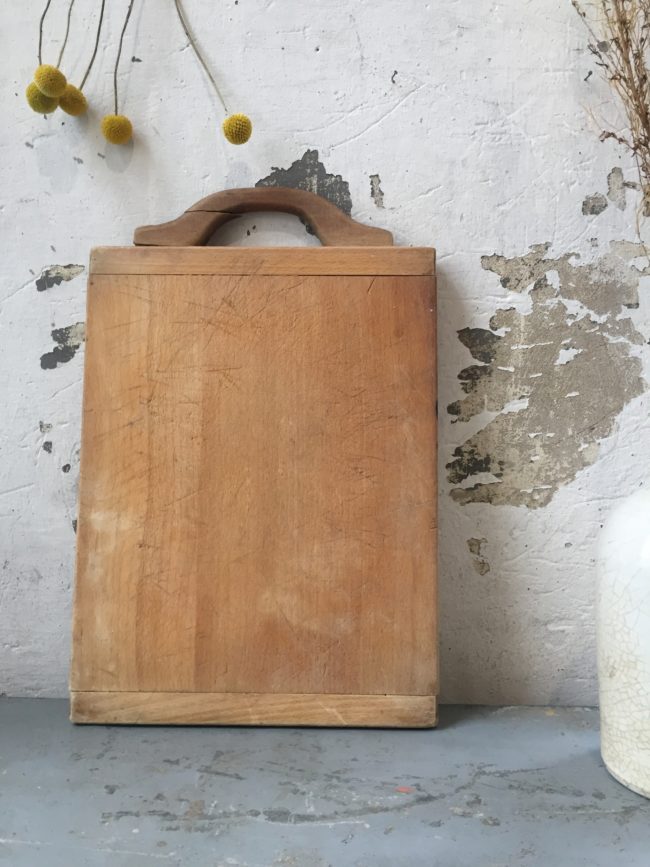 Ancienne planche à découper de forme rectangulaire avec poignée en bois.