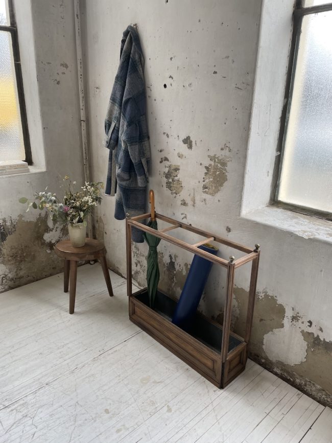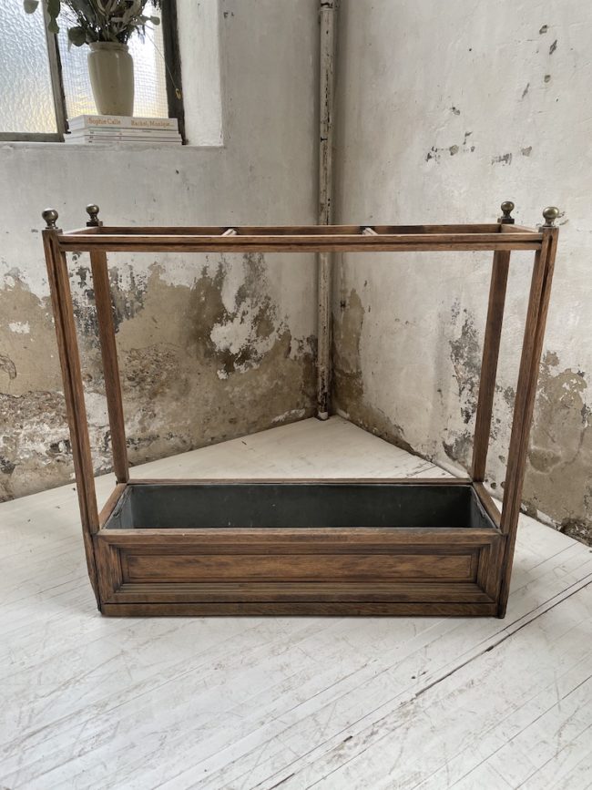 Ancien porte parapluie avec sa structure en chêne massif, ses embouts en laiton et son bac en zinc.