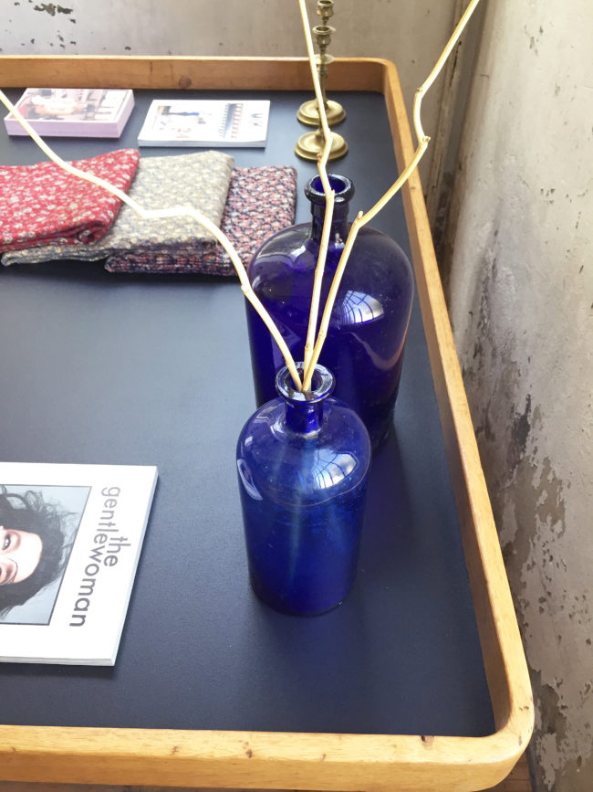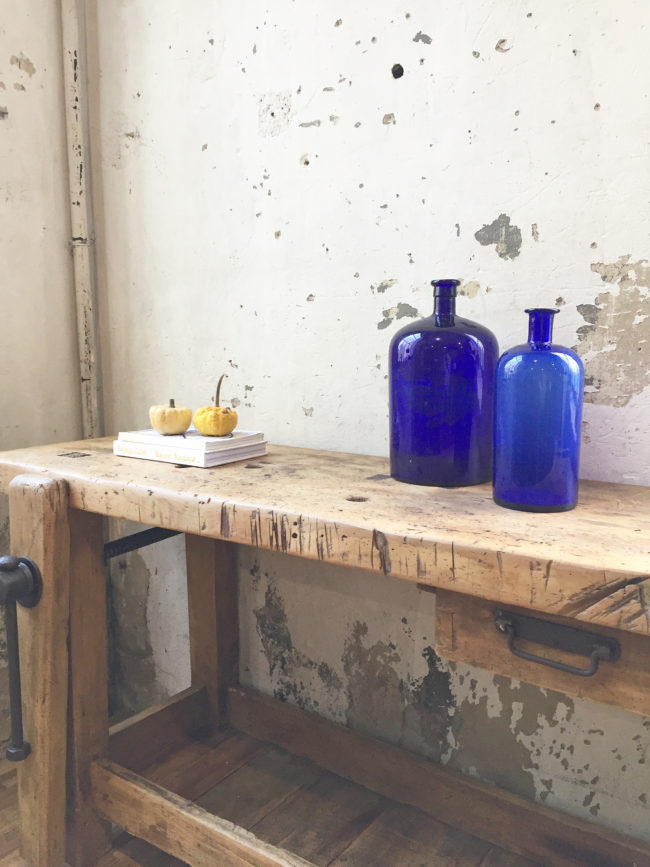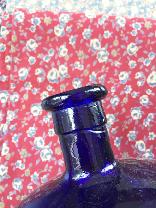 Anciens grands pots à pharmacie en verre bleu.