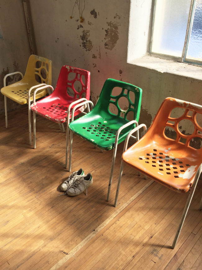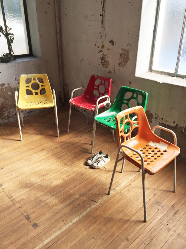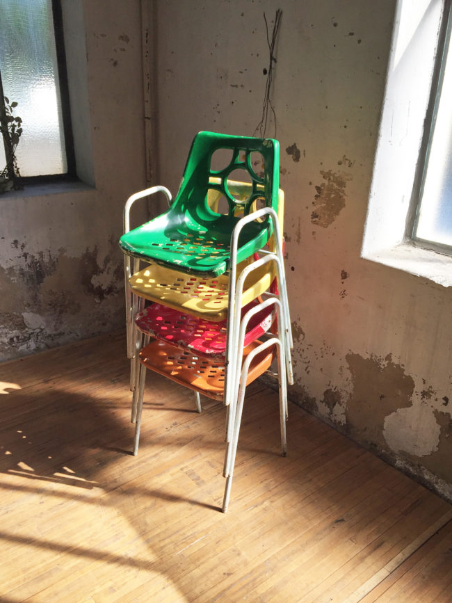 Ces chaises possèdent des signes d’usage, la peinture de l’assise s’est enlevée par endroits. Les chaises ont entièrement été brossées puis protégées de la rouille, et la peinture fixée.