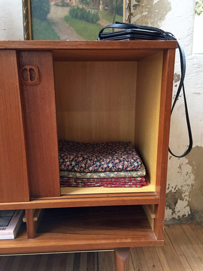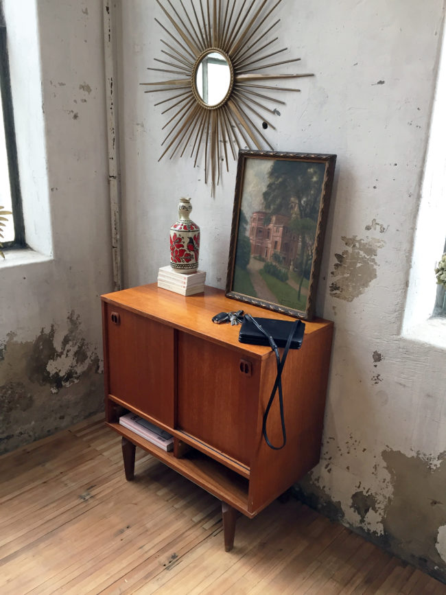 Petit meuble de rangement en bois de teck, avec ses deux façades coulissantes.