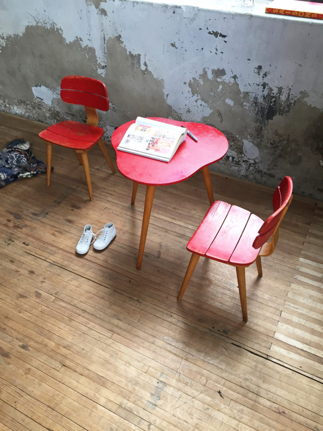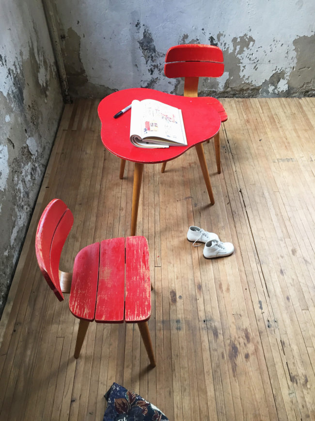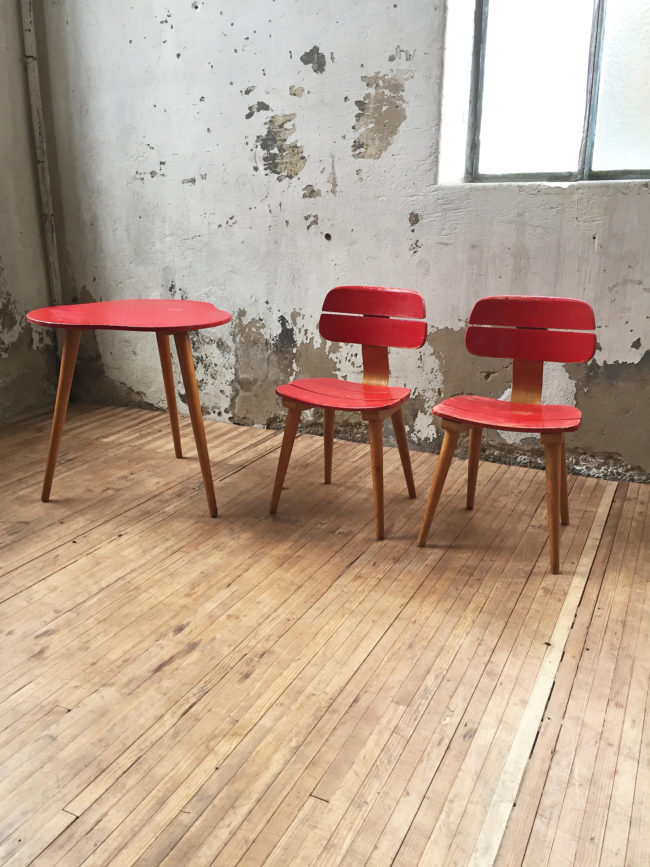 Très rare ensemble pour enfant Baumann composé d’une petite table bureau et de deux chaises.