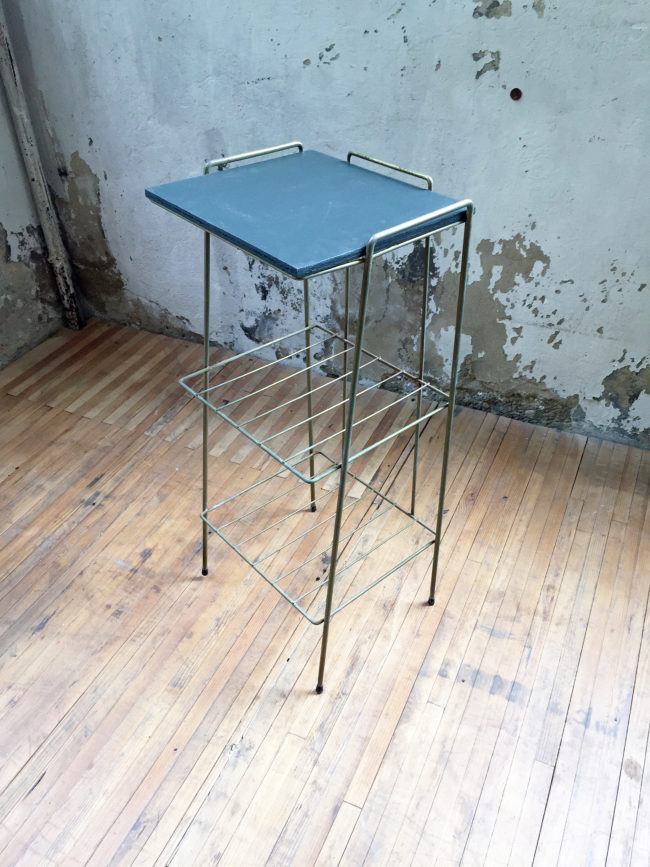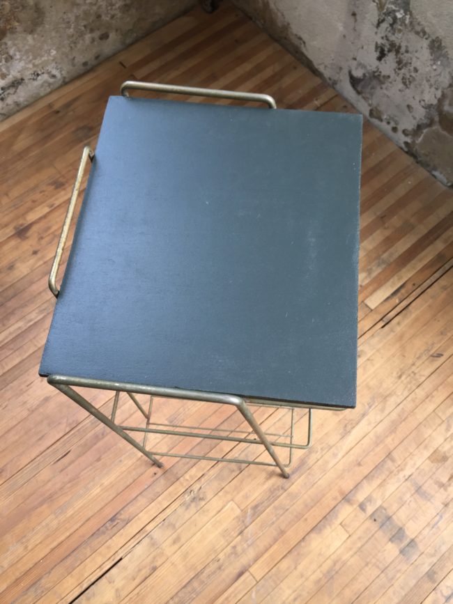 Ancienne petite sellette avec structure en métal laitonné et tablette en bois peinte en gris foncé.