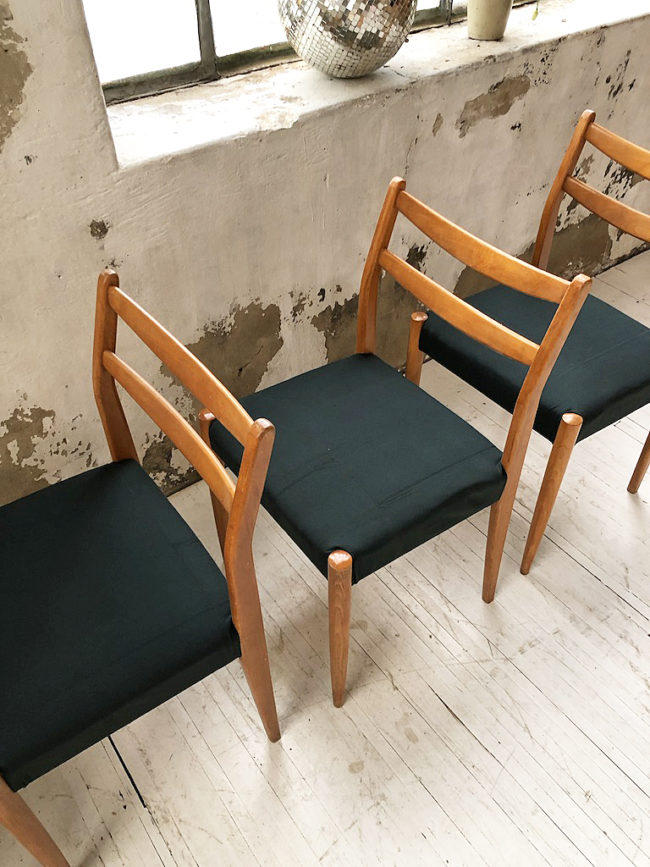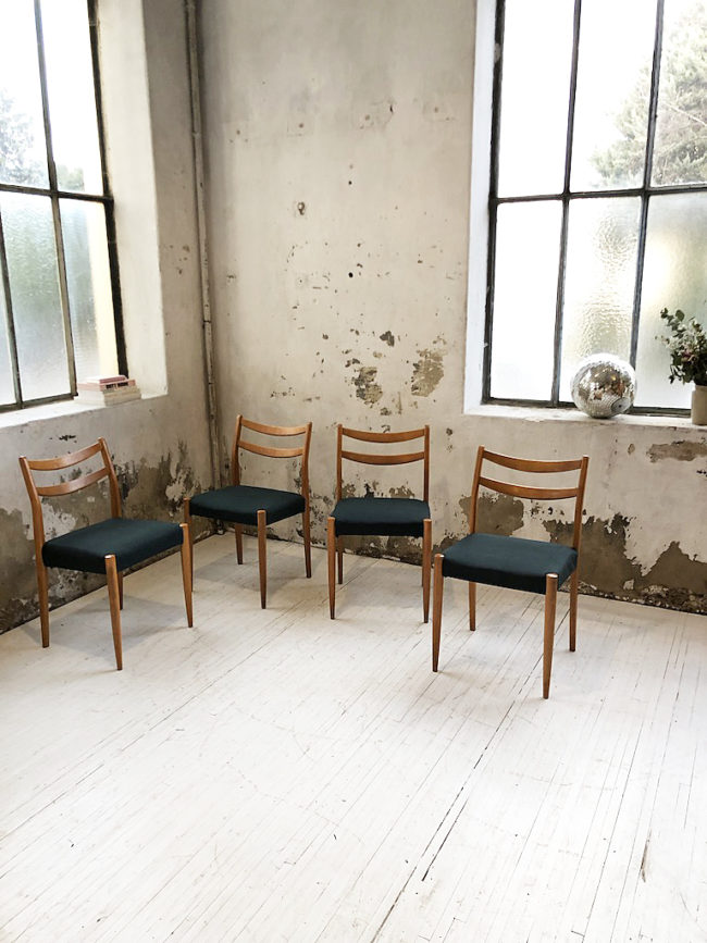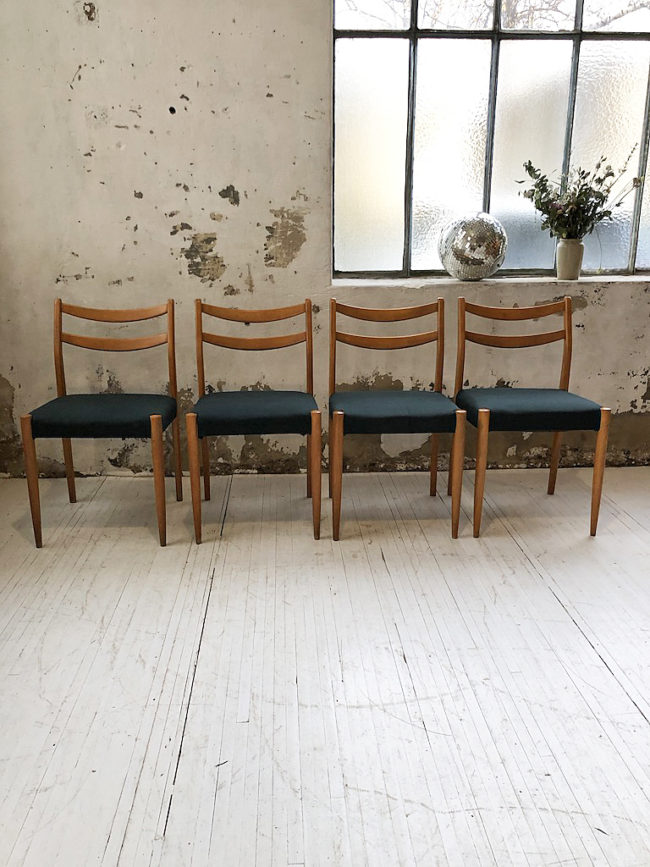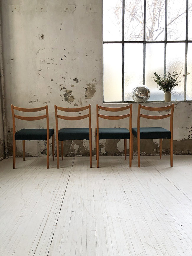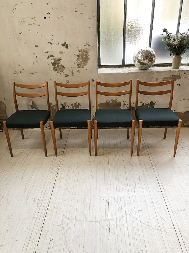 Ensemble composé de 4 chaises scandinaves en bois de hêtre doré et assises recouvertes d’un tissu épais vert forêt.