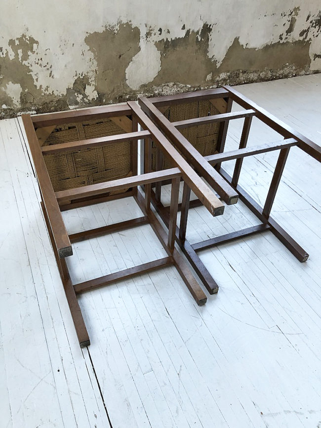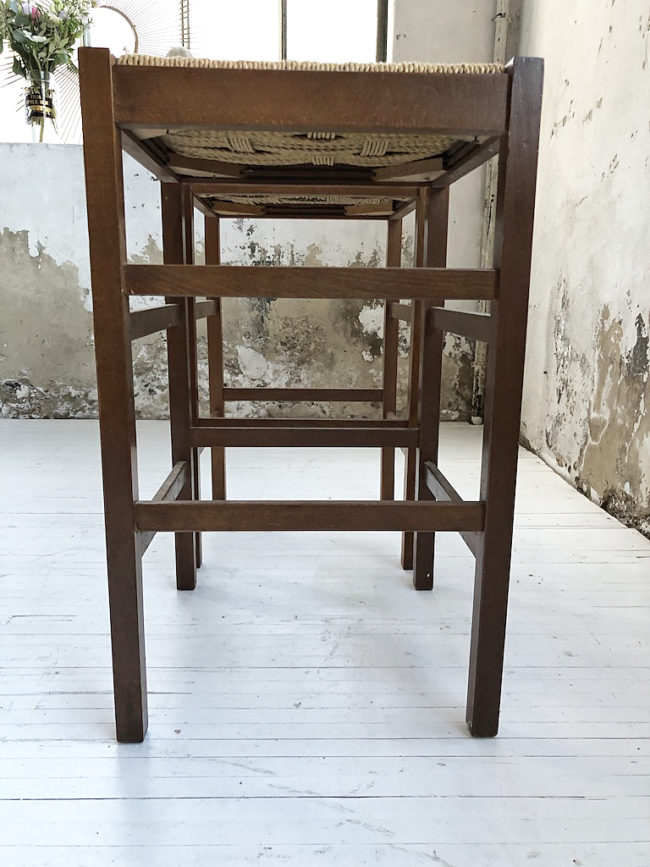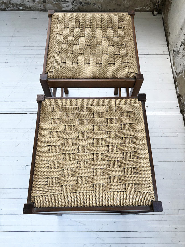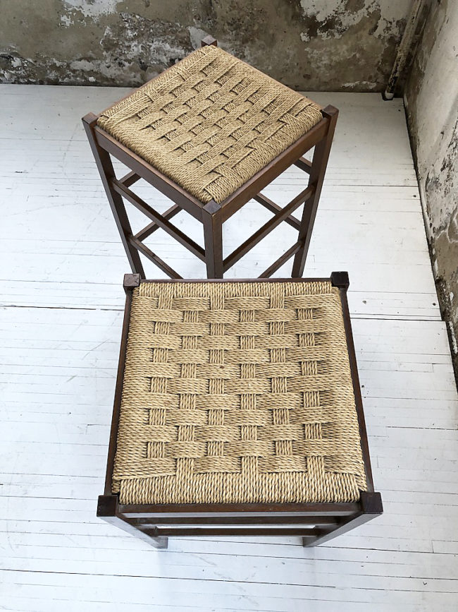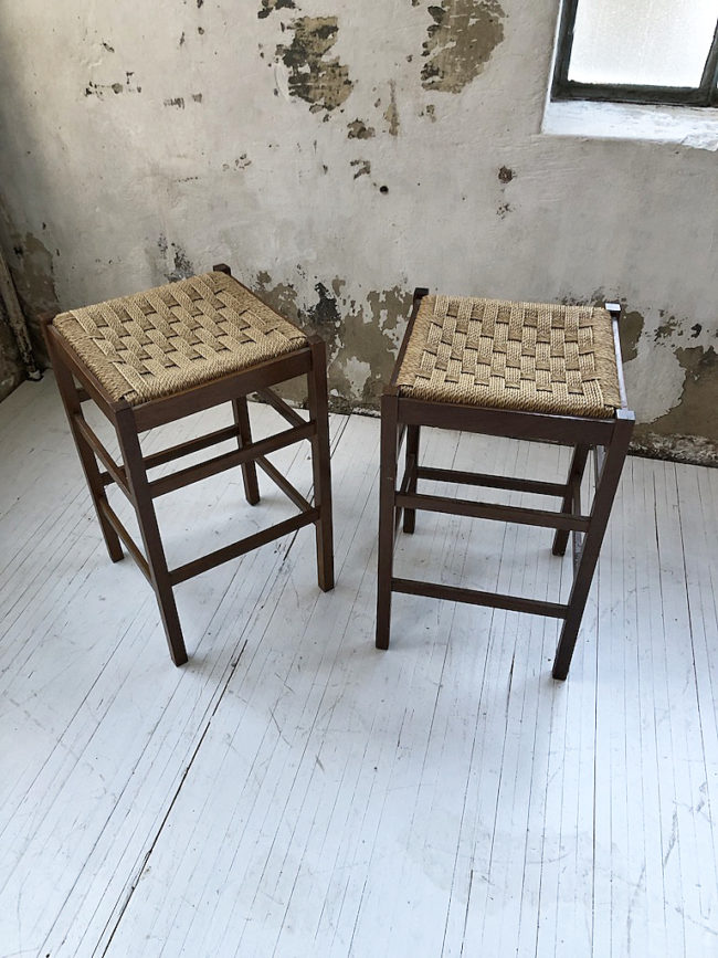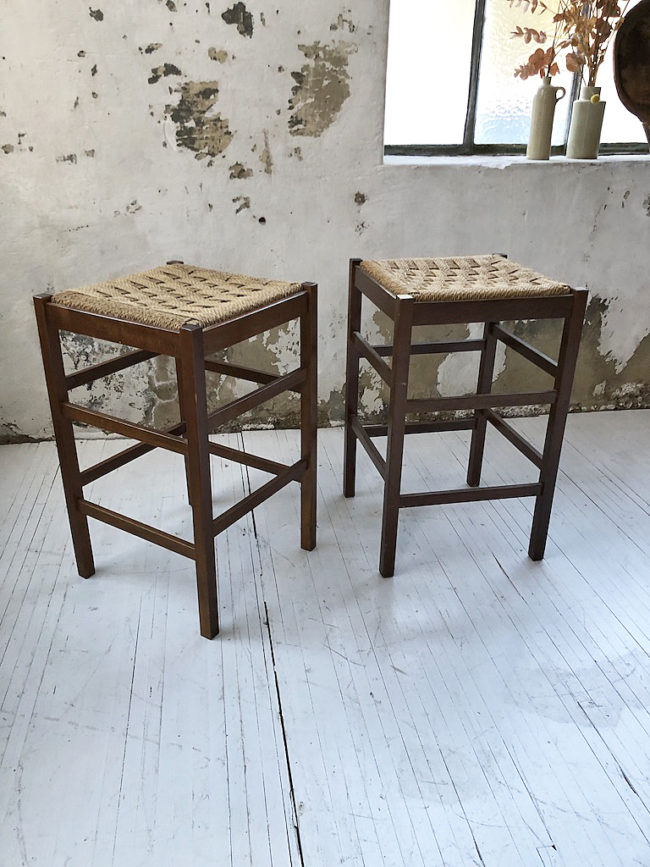 Set composé de deux tabourets haut vintage structure en chêne et assise en corde tressée.