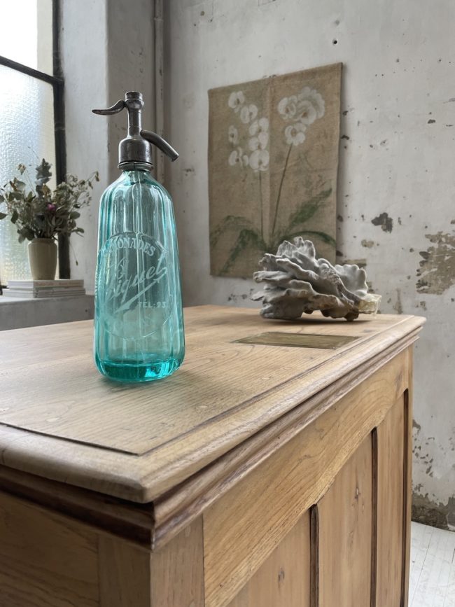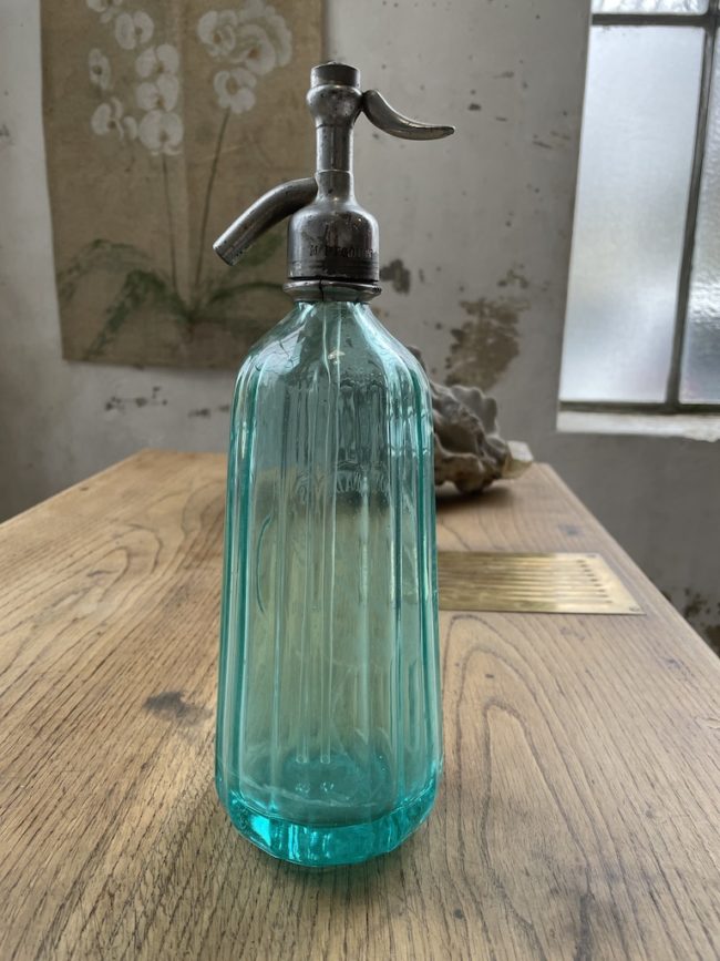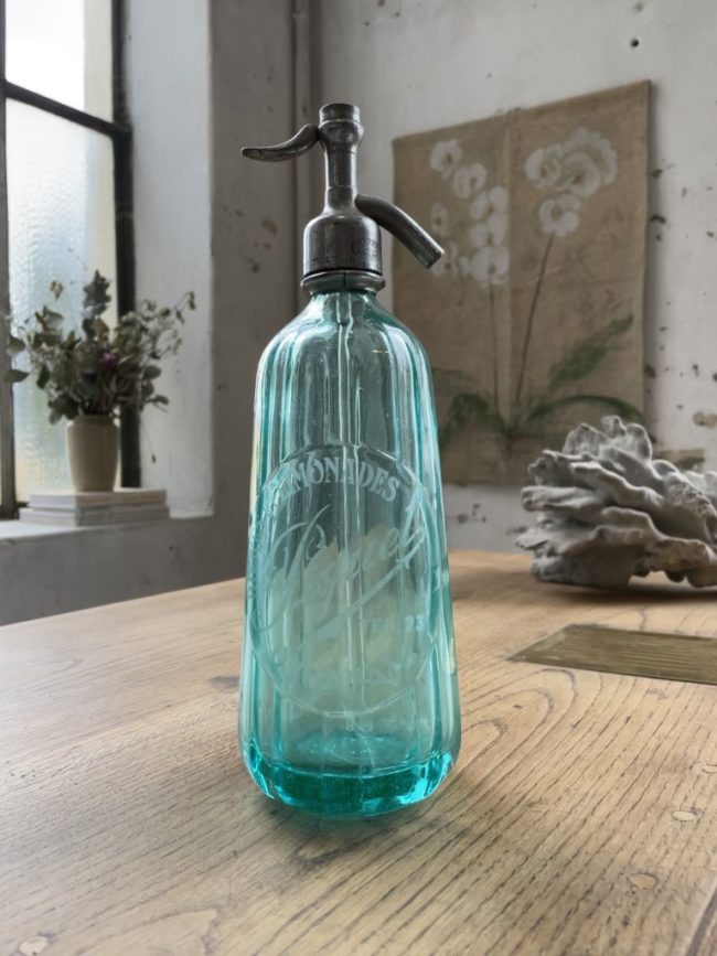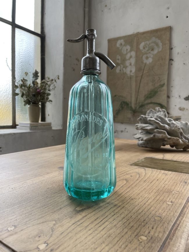 Ancien siphon d’une limonaderie en verre couleur vert-bleu, en très bon état, présentant un joli motif dans le verre.