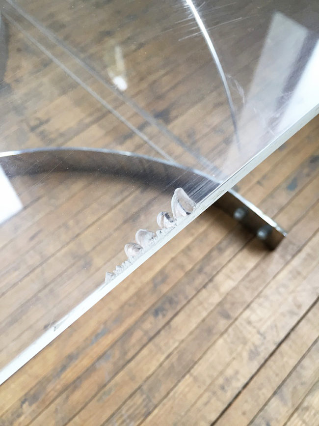 Le plateau possède quelques signes d’usage, dont une rayure un peu plus profonde de 9 cm environ, et un rayure sur un bord de 3/4 cm environ sur 1 cm.