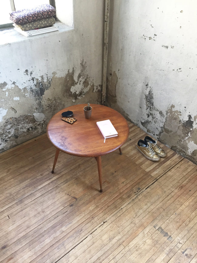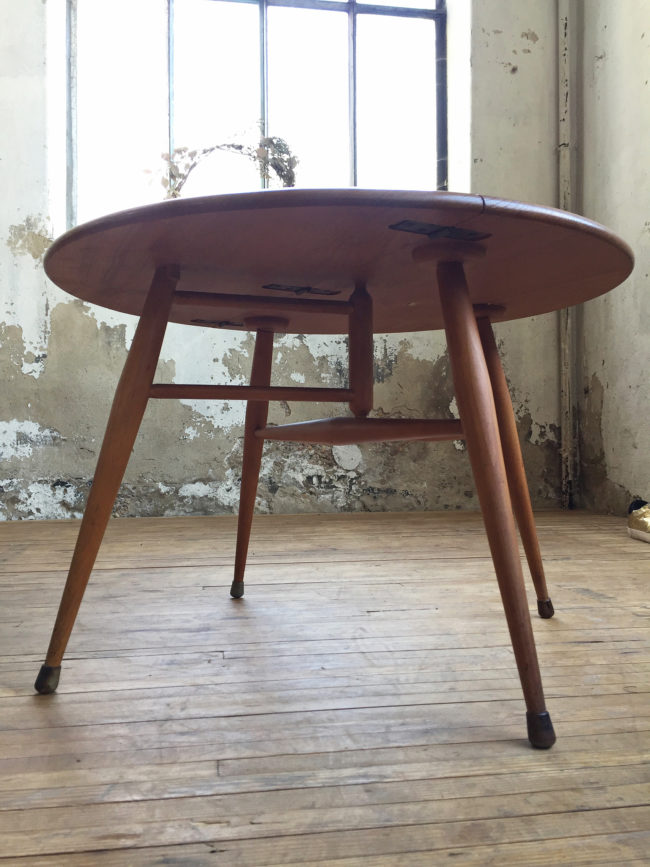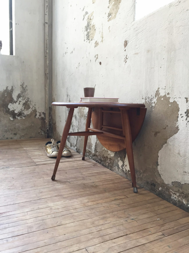 Cette table basse, peu courante, possède la particularité de rabattre une partie du plateau.