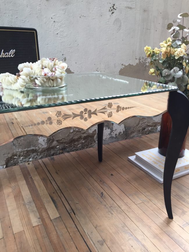 Ancienne petite table basse en miroir ciselé et biseauté.