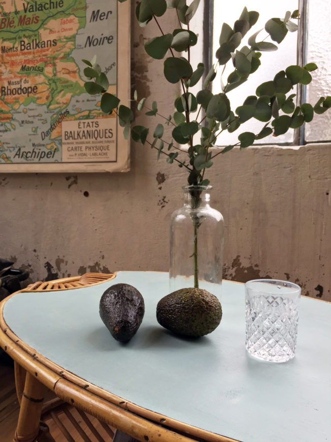 Le plateau é été poncé afin d’être peint en bleu pastel puis verni pour être protégé.