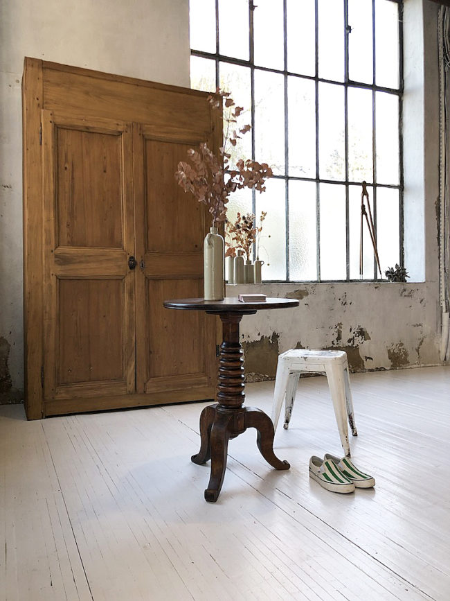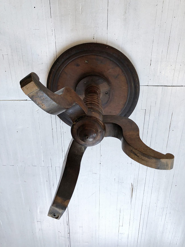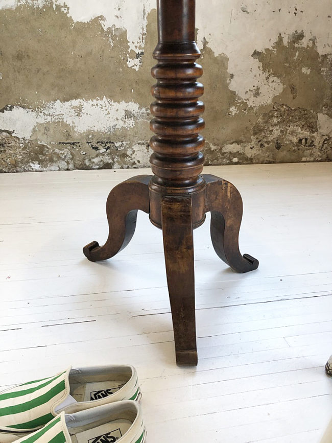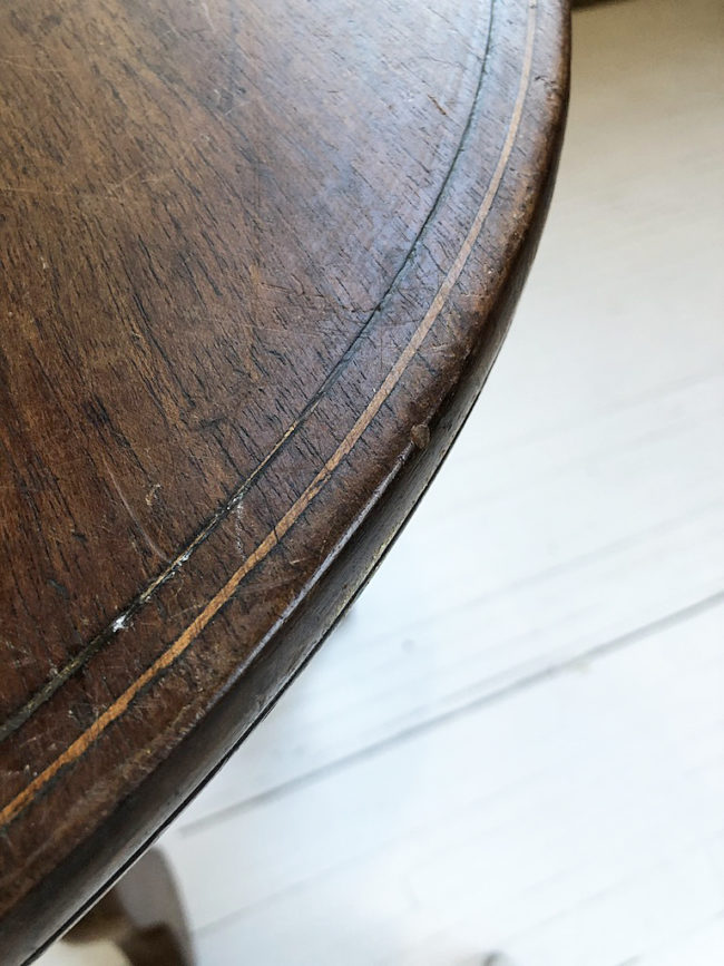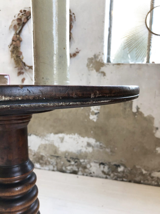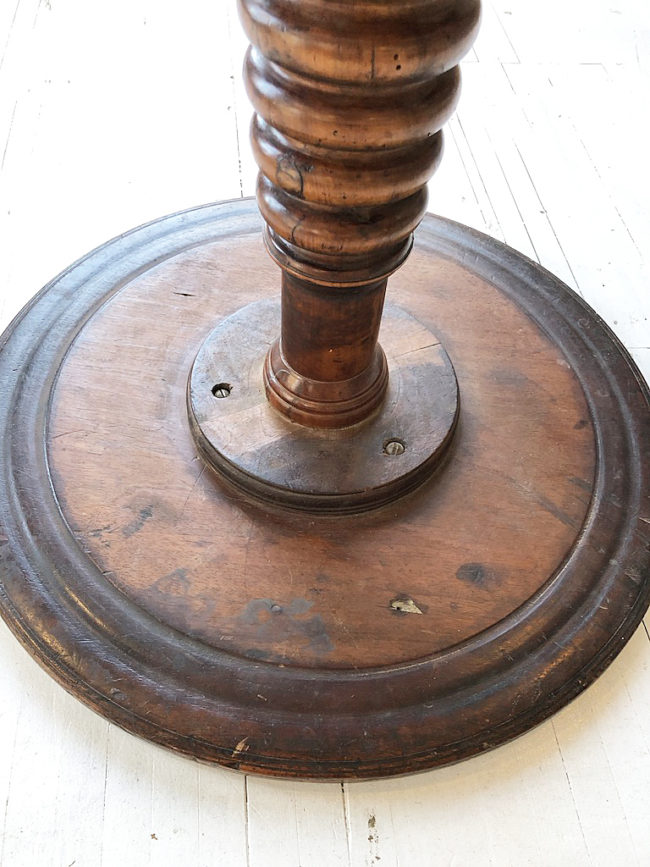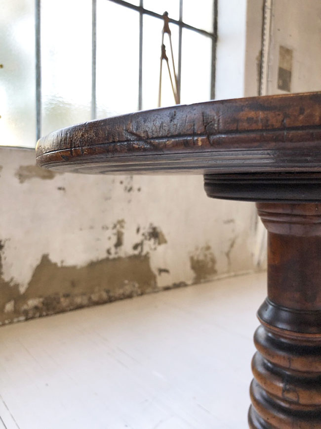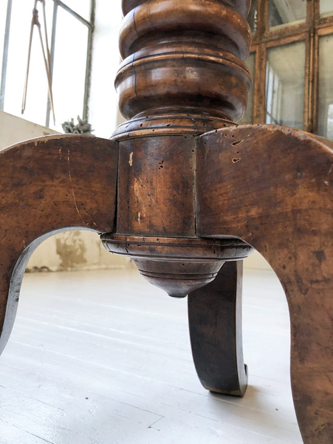 Cette table est ancienne et présente des traces d’usure, le piètement semble légèrement plus haut d’un côté que de l’autre – un des pieds a été restauré, ce qui fait que le plateau possède quelques centimètres d’écart par rapport au sol.