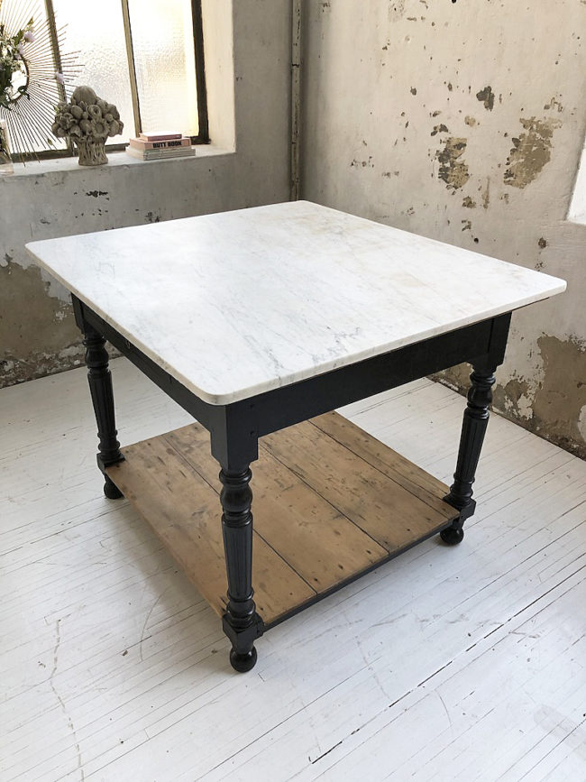 Ancienne grande table de travail utilisée dans une boucherie avec son plateau en marbre blanc.