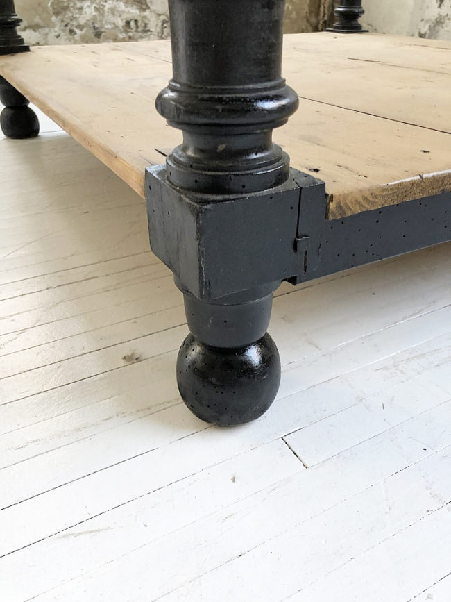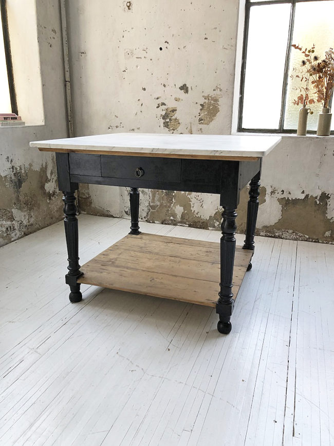 Cette pièce, de part ses dimensions et ses caractéristiques, sera absolument idéale en îlot central dans une cuisine. Ce meuble a entièrement été restauré. Son piètement en noyer massif a été poncé puis traité à l’aide d’une laque noire napoléon. La tablette basse et la tablette haute sur laquelle repose le marbre, en pin, ont été poncé, traité et volontairement laissée dans leur patine en bois brut d’origine. Les surfaces ont été protégées à l’aide d’un vernis mat transparent. Le marbre a été poncé puis traité et protégé. On perçoit néanmoins des altérations de couleurs dans celui-ci, traces de son ancienne vie.