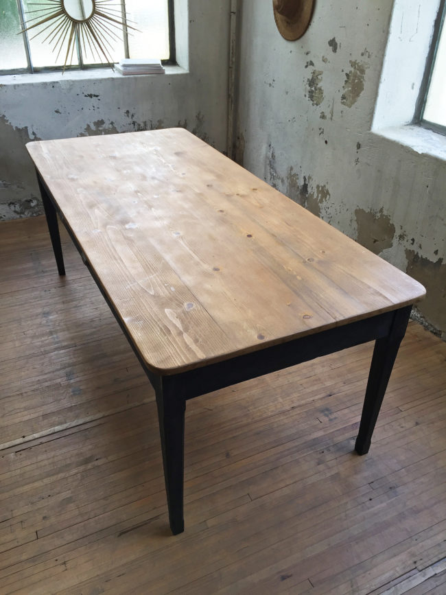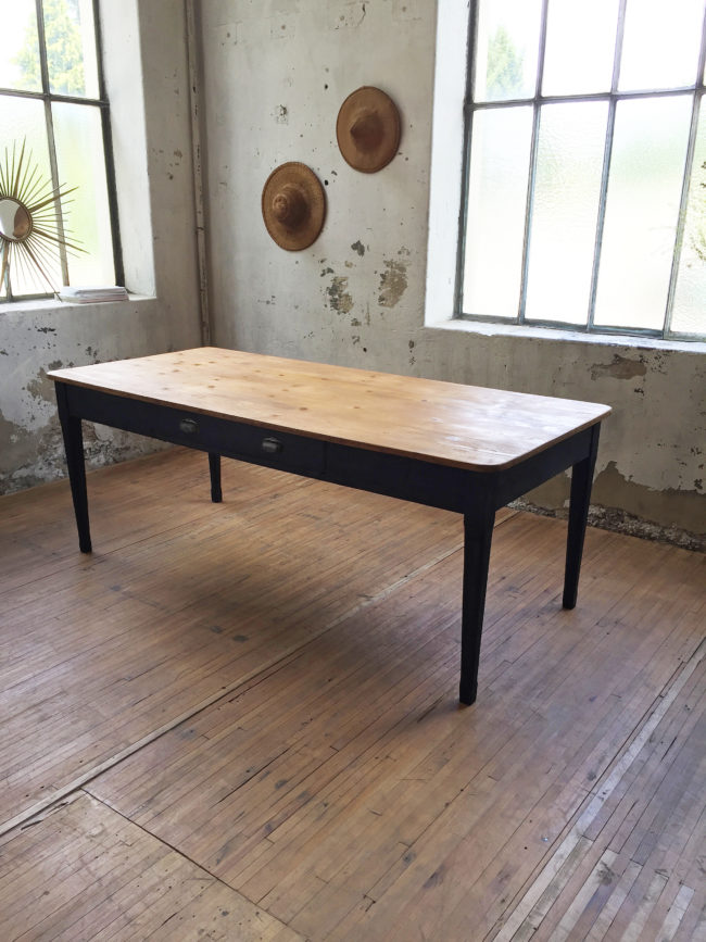 Pouvant recevoir jusqu’à 10 convives, cette table possède un piétement noir avec des pieds fuselés, un grand tiroir central aux poignées coquille, et un plateau en pin en très bel état.