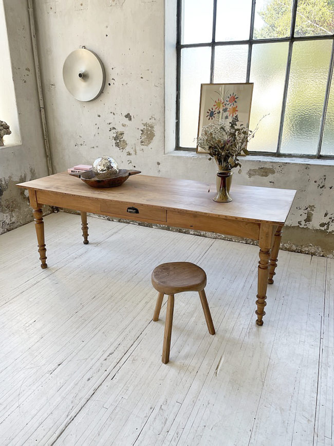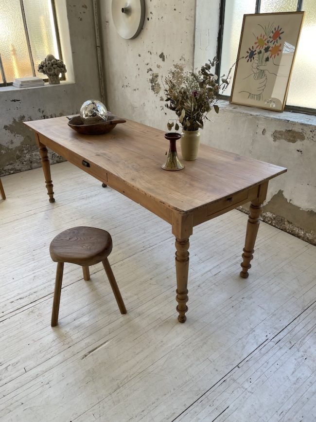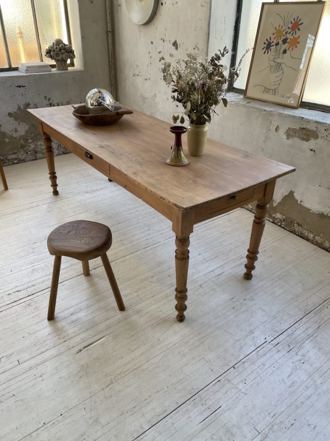 Cette table a entièrement été restaurée. Elle a été totalement poncée, traitée puis protégée à l’aide d’un vernis mat transparent, sur toute sa structure (intérieur/extérieur). Elle possède une teinte claire, la rendant très actuelle, qui lui permettra de s’intégrer dans tout type d’intérieur.