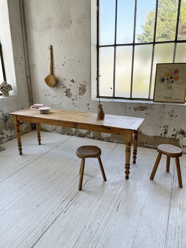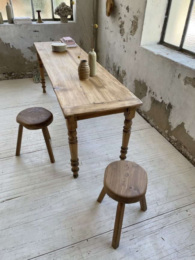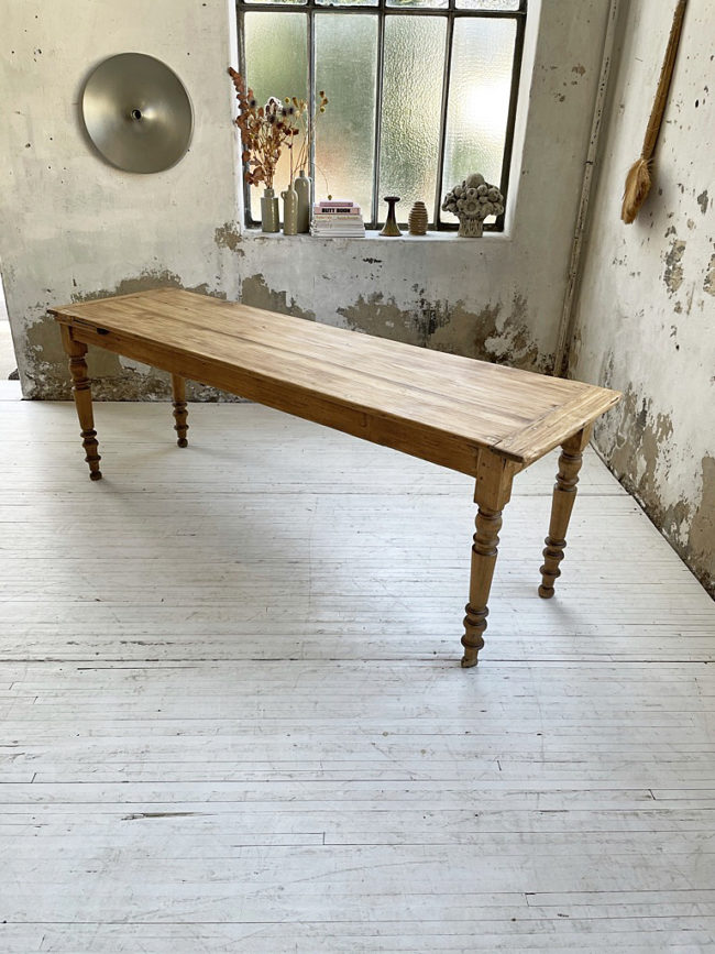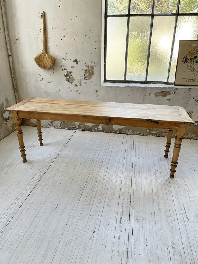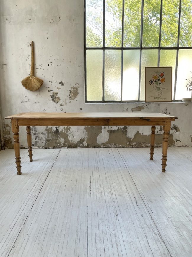 Cette table a entièrement été restaurée. Elle a été totalement poncée, traitée puis protégée à l’aide d’un vernis mat transparent, sur toute sa structure (intérieur/extérieur). Elle possède une teinte claire, la rendant très actuelle, qui lui permettra de s’intégrer dans tout type d’intérieur.