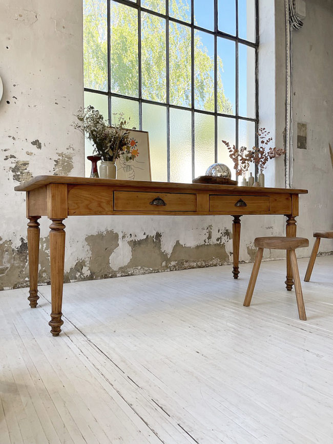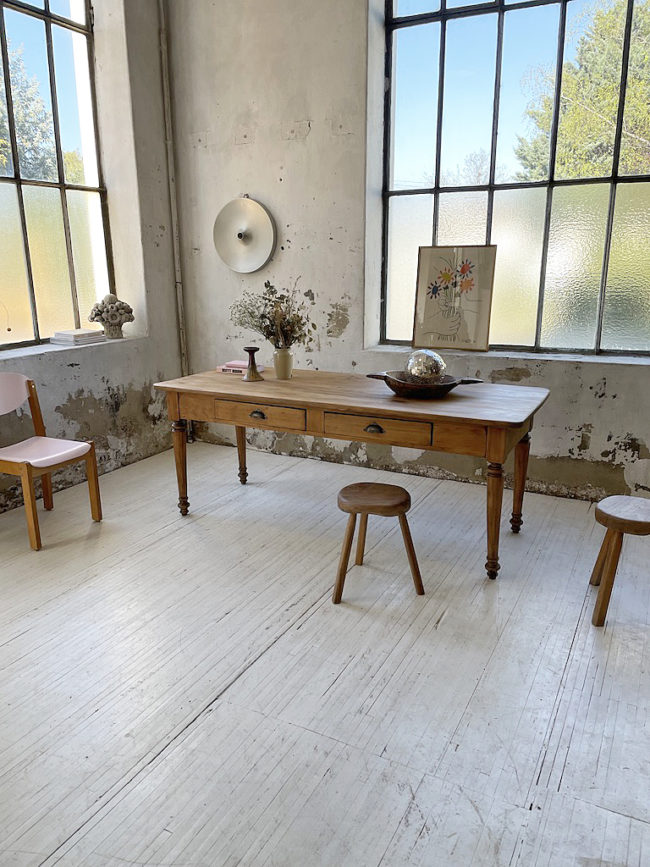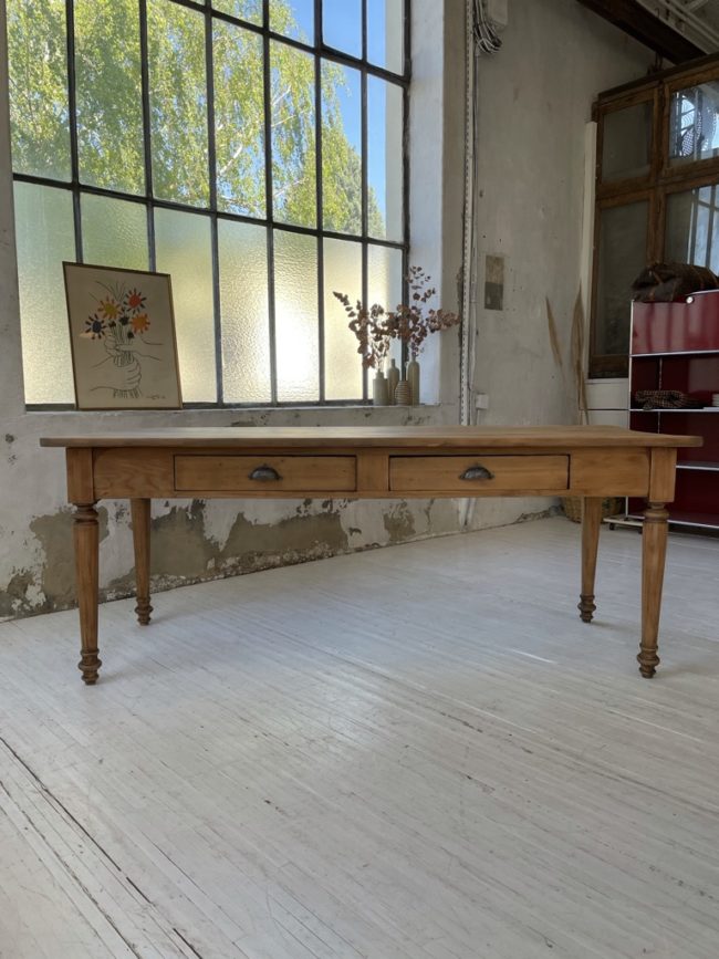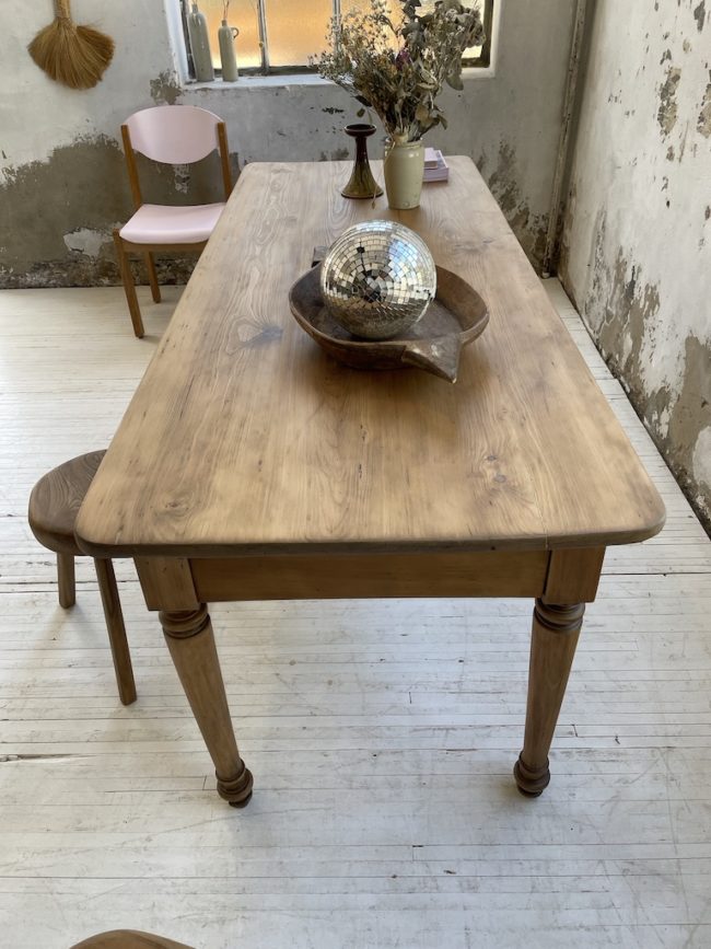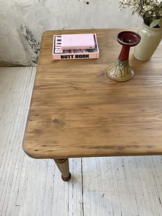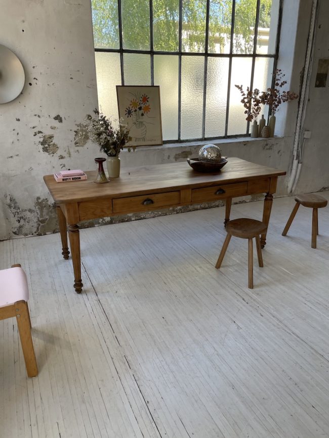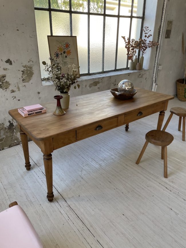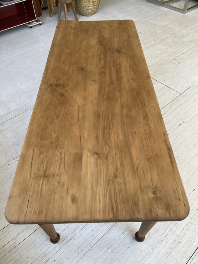 Cette table a entièrement été restaurée. Elle a été totalement poncée, traitée puis protégée à l’aide d’un vernis mat transparent, sur toute sa structure (intérieur/extérieur). Elle possède une teinte claire, la rendant très actuelle, qui lui permettra de s’intégrer dans tout type d’intérieur.