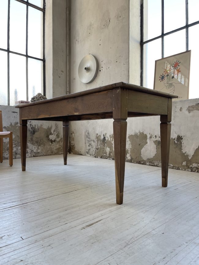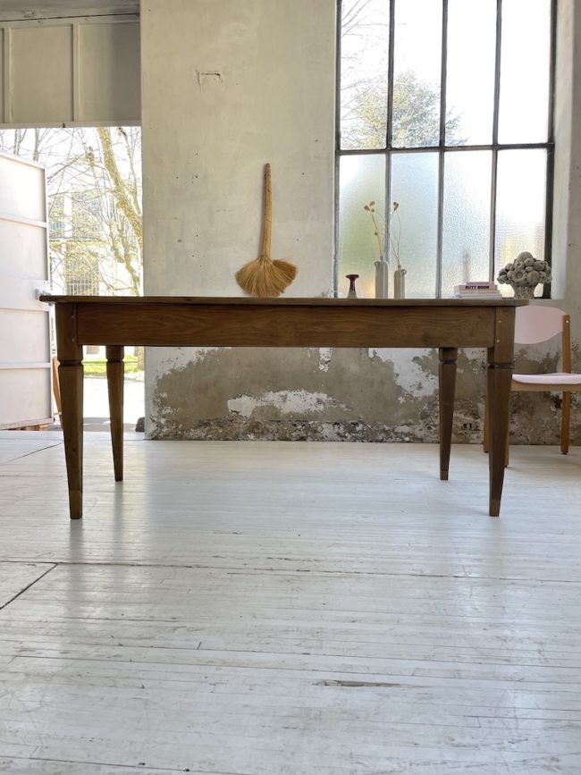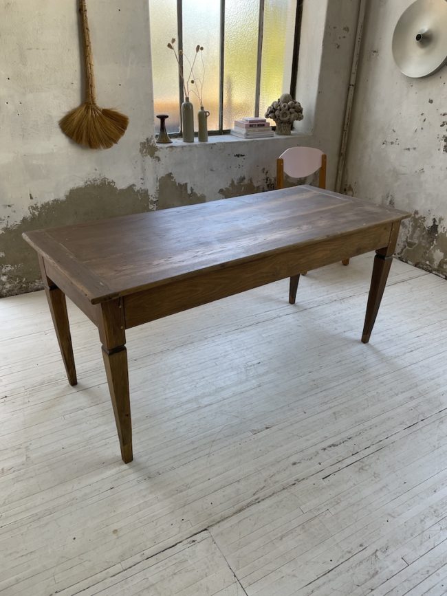 Ancienne table de ferme en bois massif milieu XIXème, composée d’une structure entièrement en chêne. Cette table possède un plateau avec une très belle patine du temps, on y aperçoit différents nuances et les traces du passé lui conférant toute son authenticité et son charme. Ses pieds fuselés lui apportent son allure légère. Entièrement chevillée.
