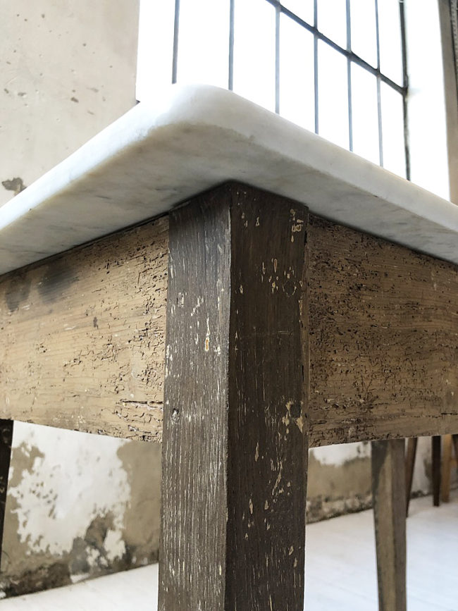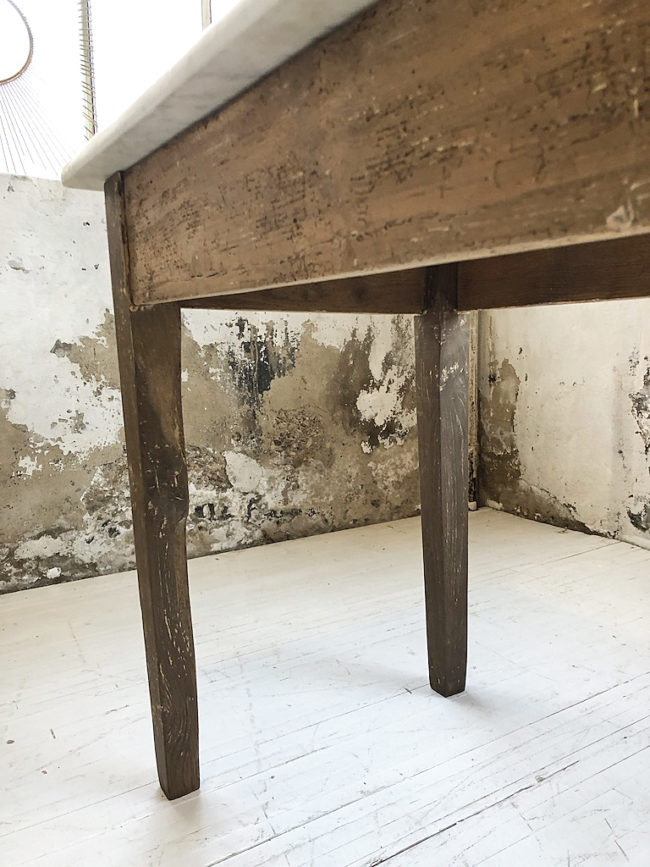 Ancienne petite table de ferme, table d’appoint, avec son piètement en pin et chêne, ainsi que son très beau plateau en marbre blanc.