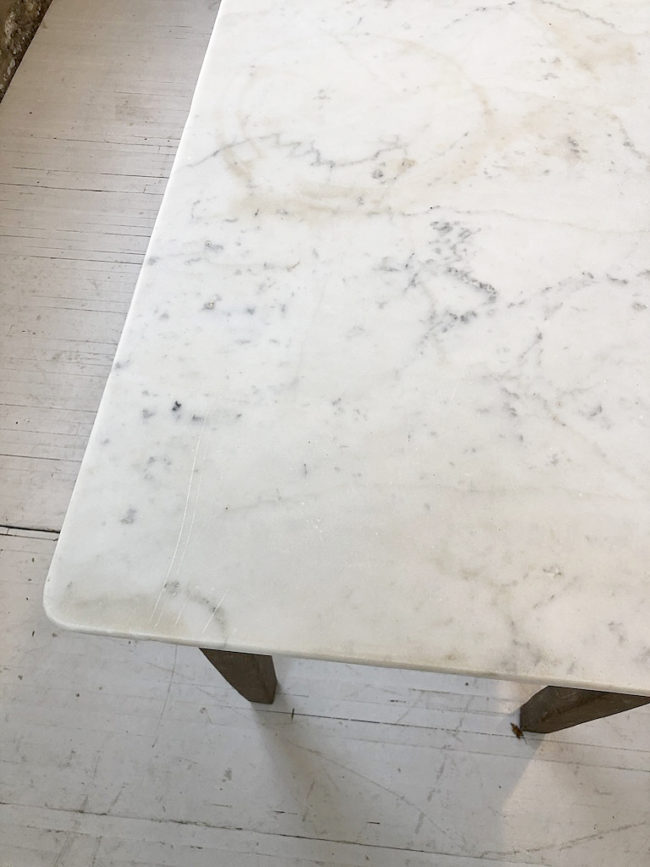 Du fait de son grand âge, le bois du piètement possède des défauts et une patine certaine, quant à lui le marbre garde des traces résiduelles de son ancienne vie. Se référer aux photos.