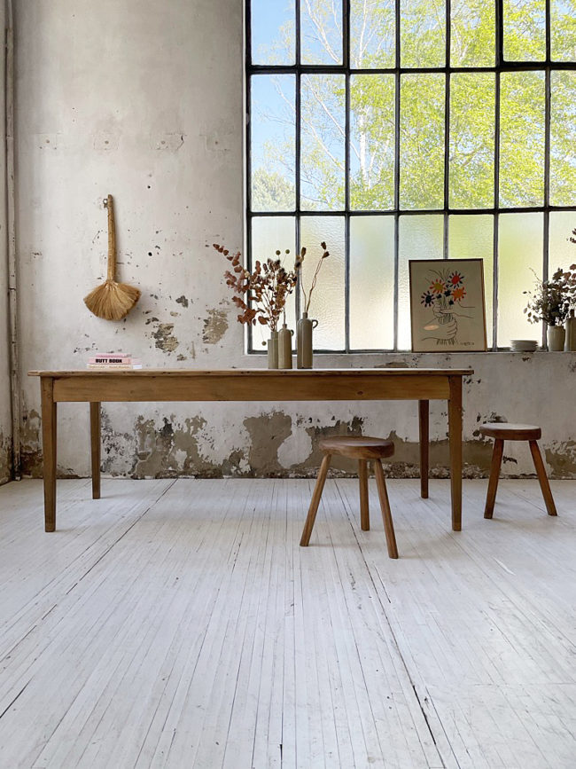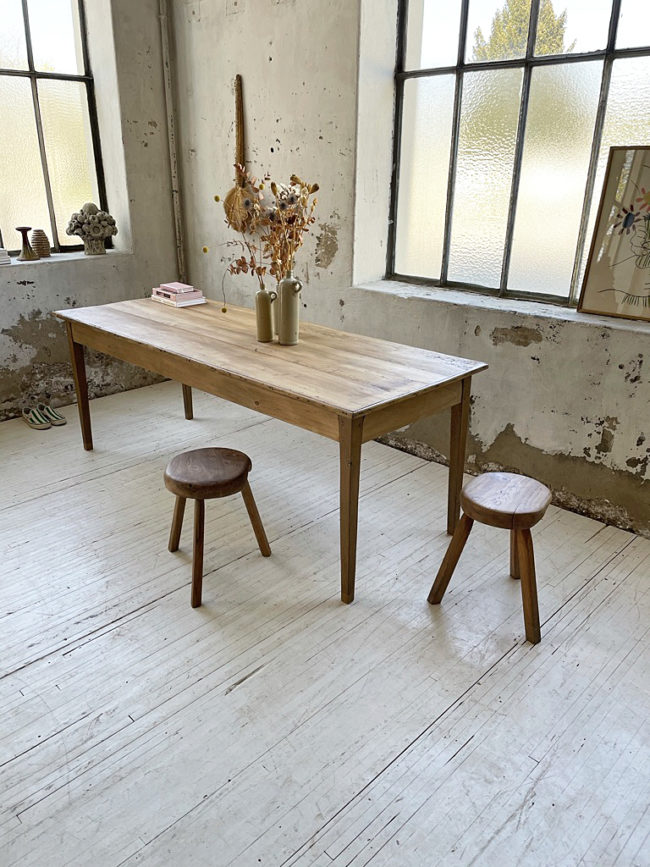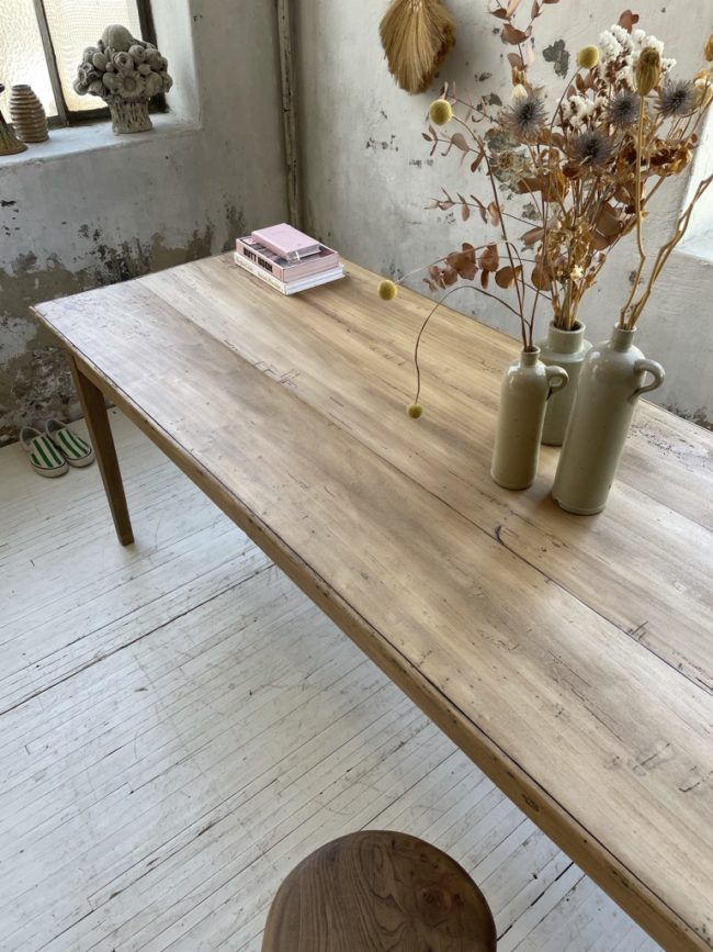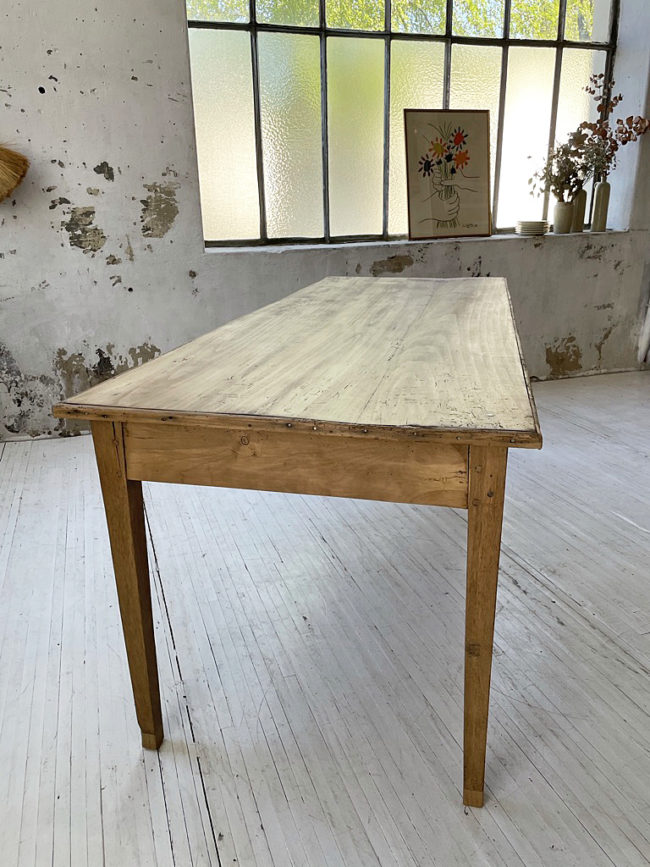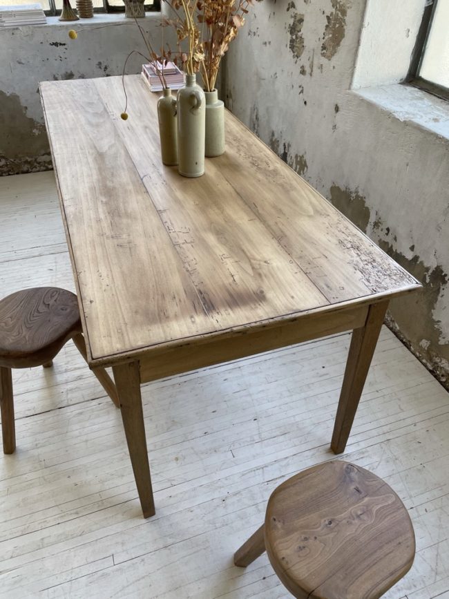 Cette table a entièrement été restaurée, elle possède des rehausses réalisées par mon ébéniste. Elle a été totalement poncée, traitée puis protégée à l’aide d’un vernis mat transparent, sur toute sa structure (intérieur/extérieur). Elle possède une teinte claire, la rendant très actuelle, qui lui permettra de s’intégrer dans tout type d’intérieur.