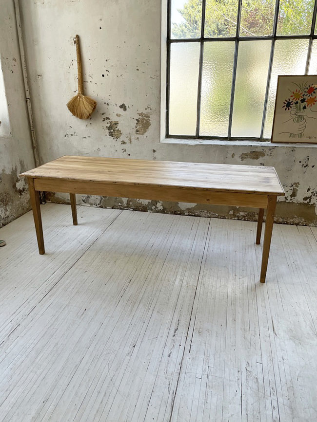 Ancienne table de ferme en bois massif milieu XIXème, composée d’un plateau et traverses en pin et d’un piètement en chêne. Cette table possède un plateau surmonté de baguettes. Ses pieds fuseaux très fins lui confèrent une belle allure aérienne. Entièrement chevillée.