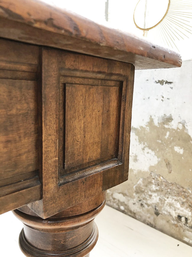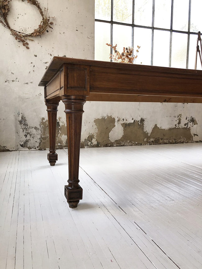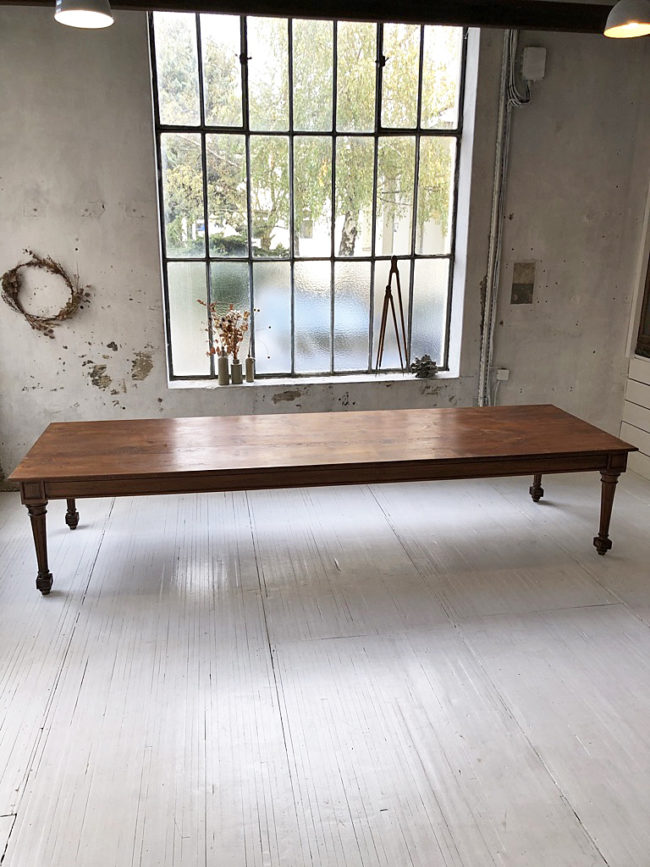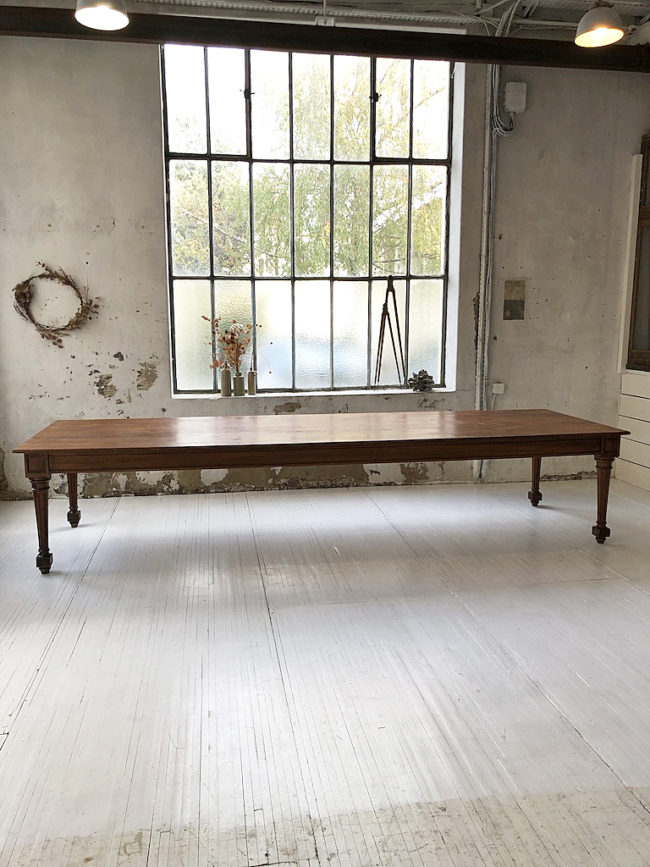 Le plateau possède un veinage très beau. La table a entièrement été restaurée, ses teintes sont superbes. Le plateau et la structure sont dans un état excellent. La patine générale lui confère tout son charme. Seul 4 pieds suffisent à sa structure, apportant toute la légèreté à cette pièce XXL, des traverses sous le plateau permettent un maintien idéal et très robuste à cette table, sans que le plateau ne puisse cintrer.