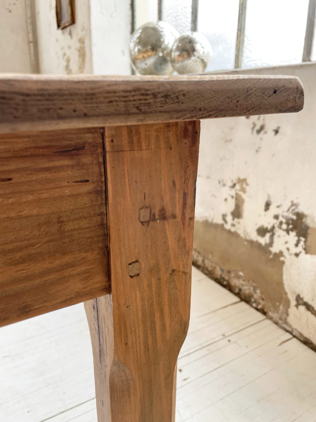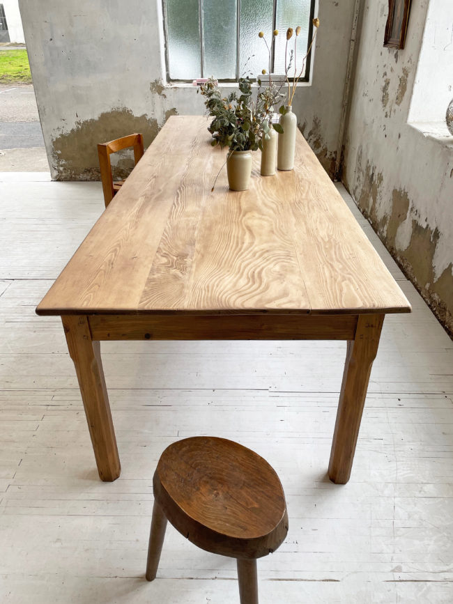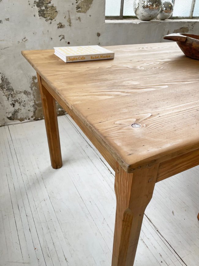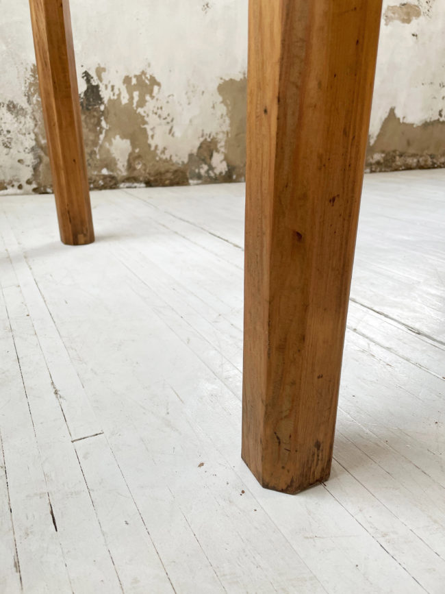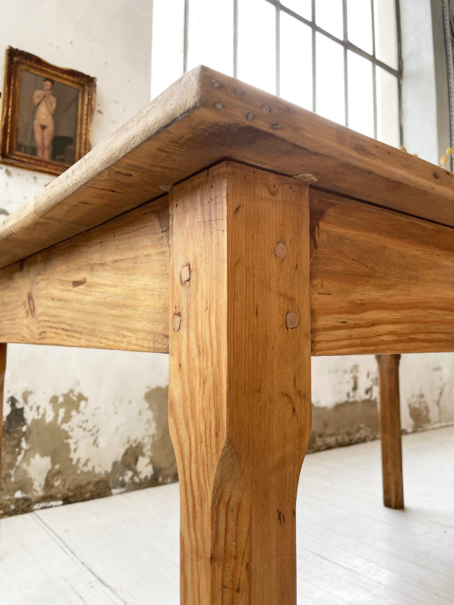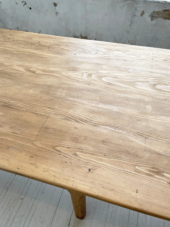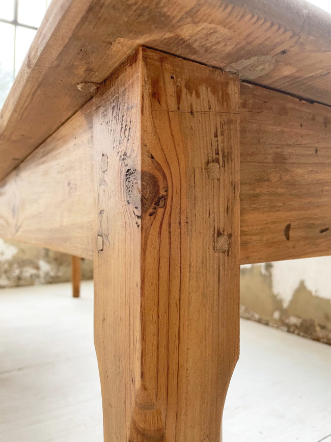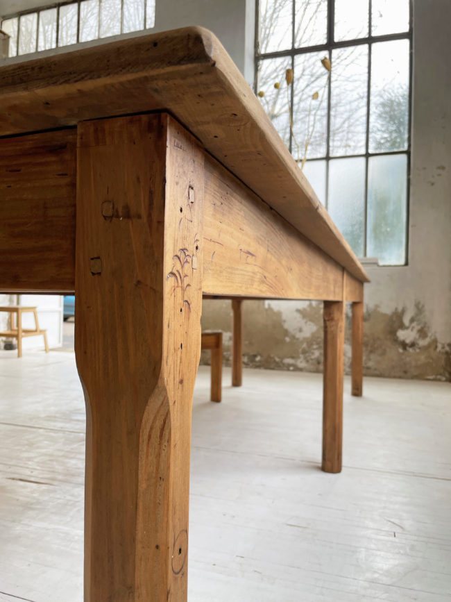 Ancienne table de ferme de format xxl en pin. Elle possède ses 6 pieds qui lui confèrent une très bonne stabilité, et un plateau bien droit qui ne cintre pas, du fait de sa grande longueur. Cette table a entièrement été restaurée par mon ébéniste afin de la mettre à hauteur pour le quotidien et permettre un passage de jambes idéal. Elle a entièrement été poncée, puis très légèrement teintée afin de faire ressortir le veinage, puis protégée à l’aide d’un vernis mat transparent. Entièrement chevillée. La plateau possède une très belle patine, avec de très belles nuances, le bois est légèrement piqué par endroits, lui conférant un charme et une authenticité certaine.