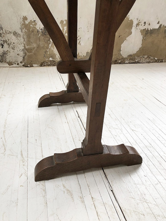 Table en bois de vigneron à plateau ovale du XIXème. Le piètement est en noyer, le plateau en pin. Cette pièce est ancienne et présente des traces d’imperfection dans le bois. Le plateau a entièrement été poncé, puis protégé à l’aie d’un vernis mat transparent.