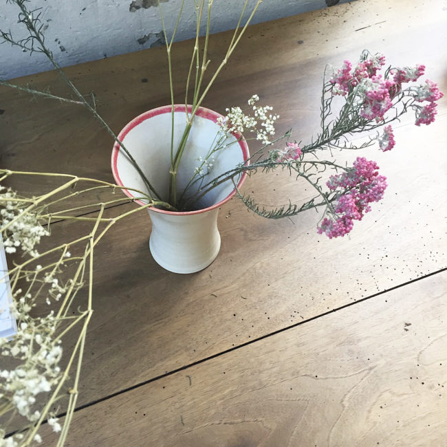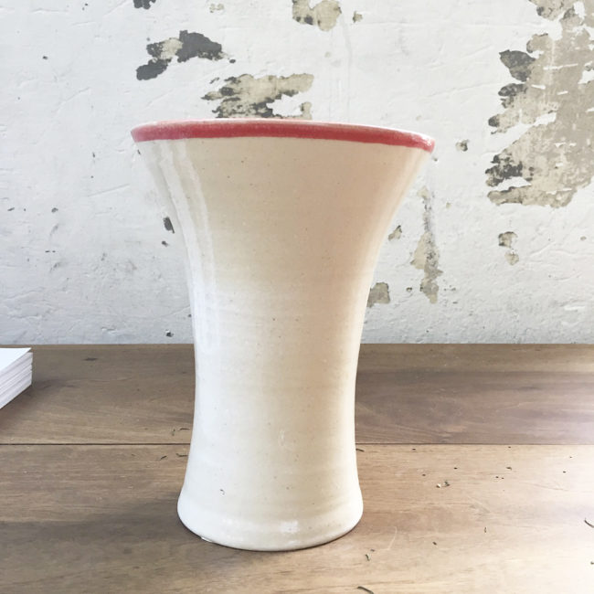 Joli vase artisanal en céramique blanche et liseré rouge.