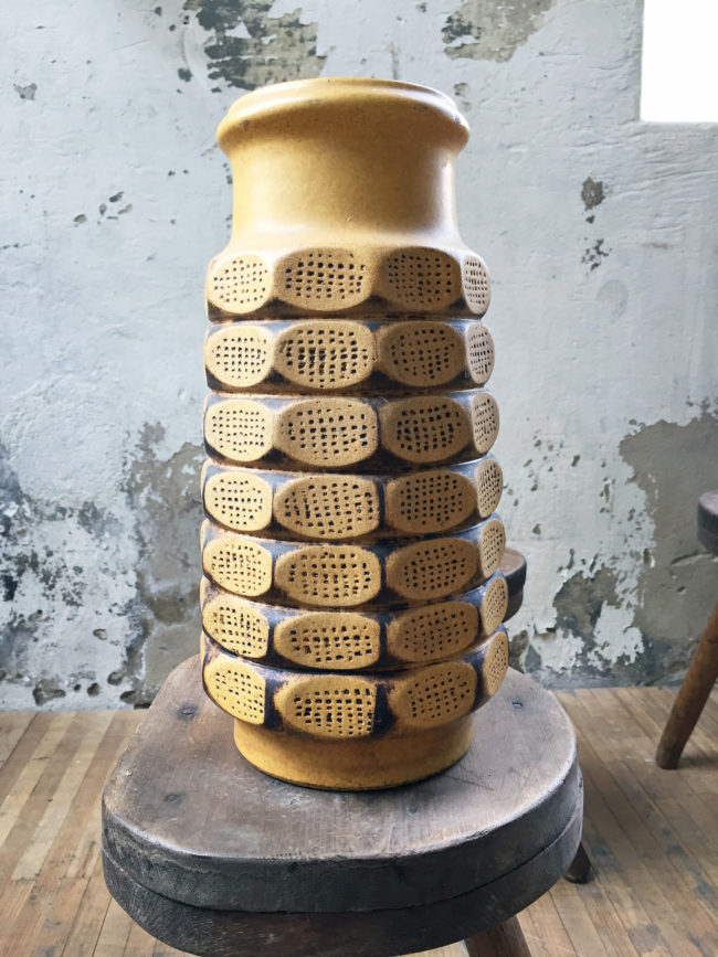 Il possède une jolie glaçure ocre et brun foncé, avec un décor abstrait en relief géométrique qui en font une pièce assez indémodable.