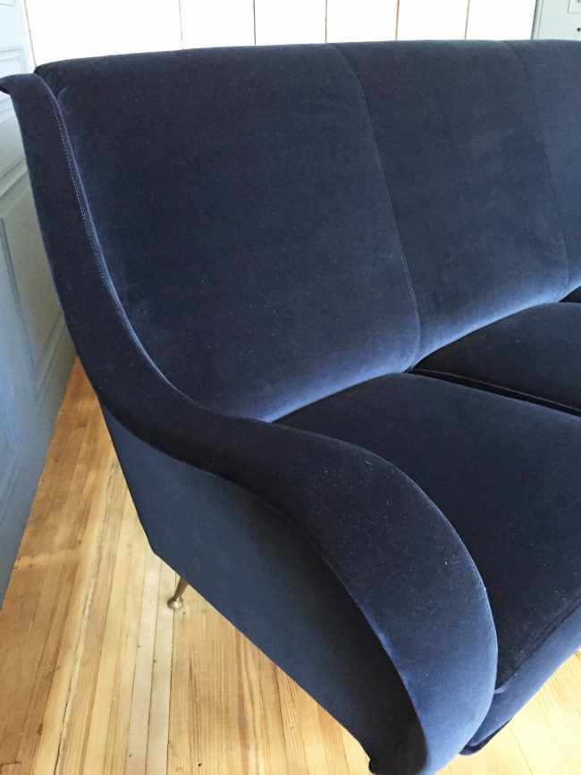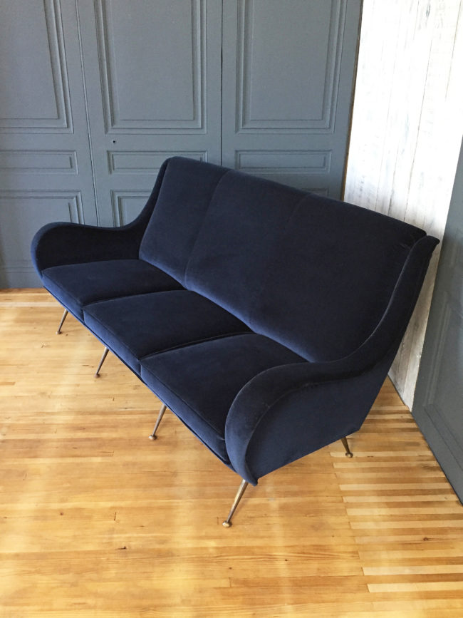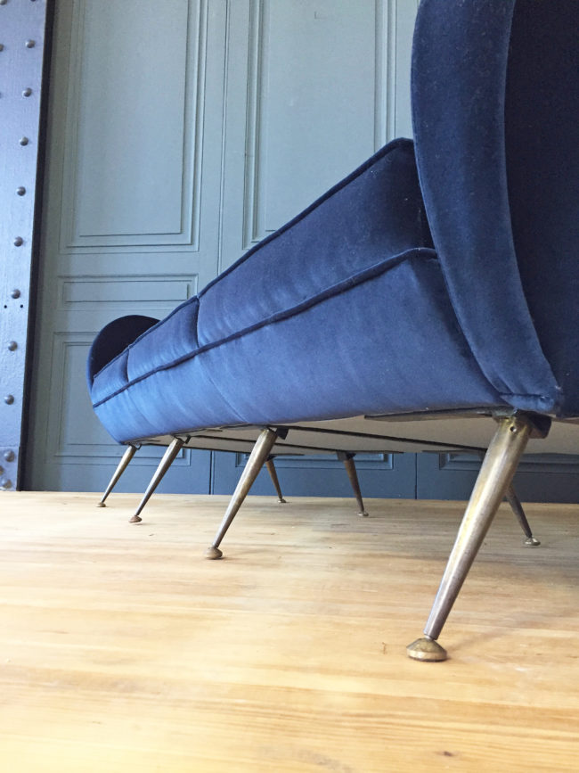 Entièrement retapissé dans un velours très lumineux bleu nuit, il possède huit pieds laitonnés fuselés.