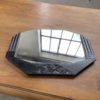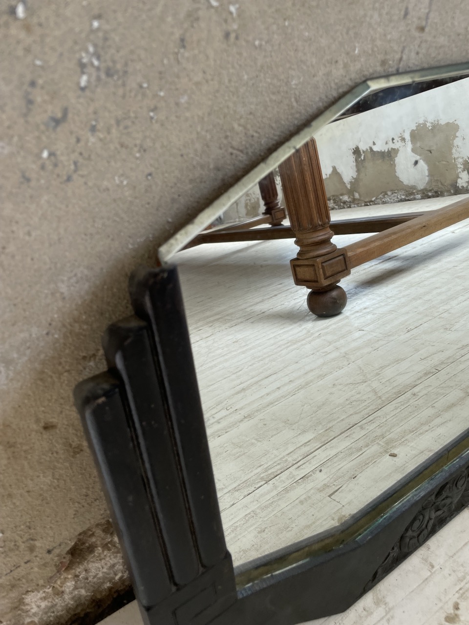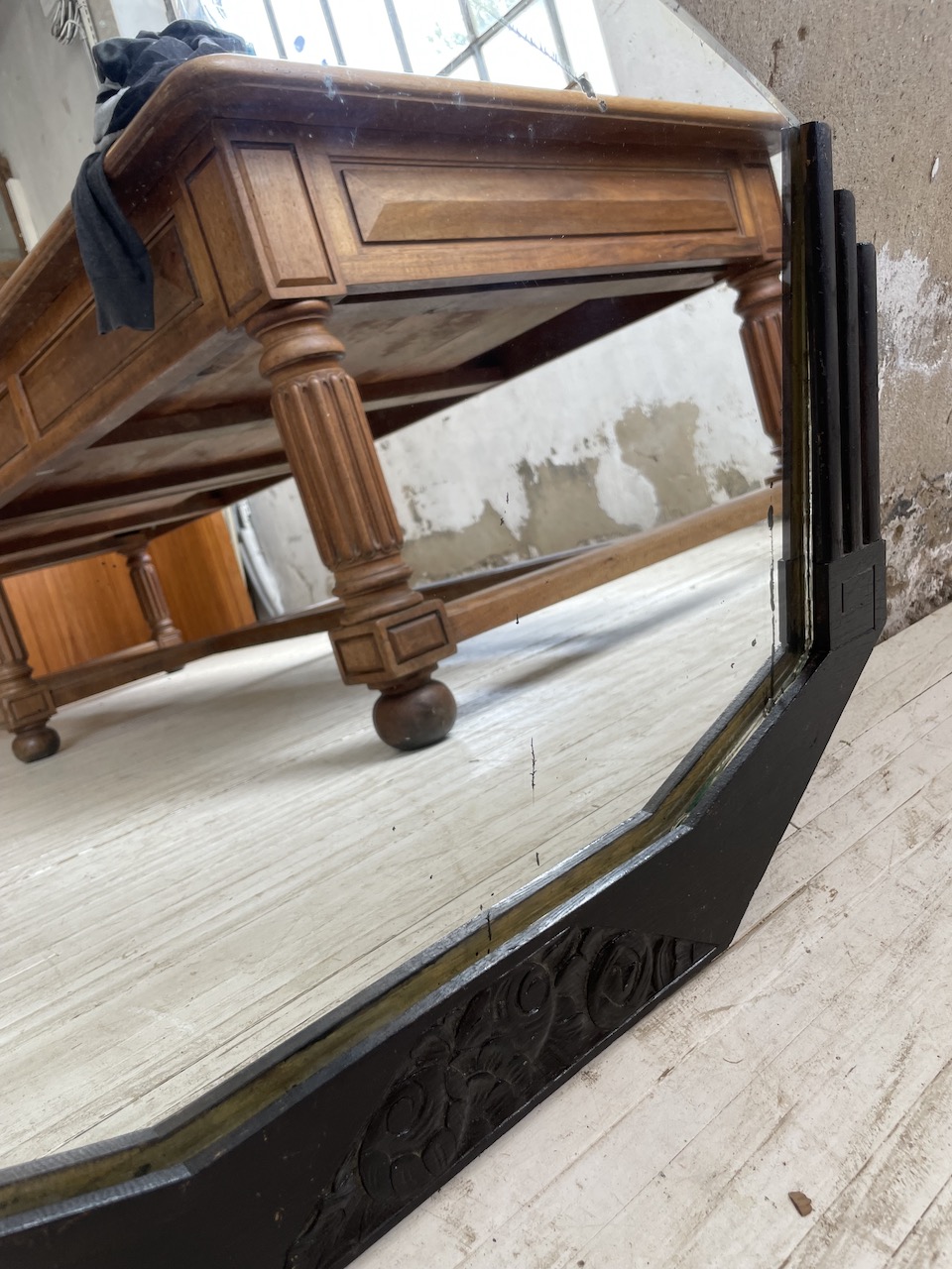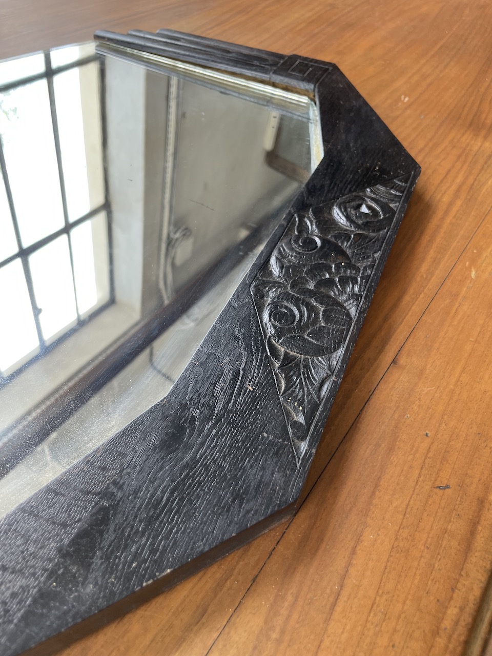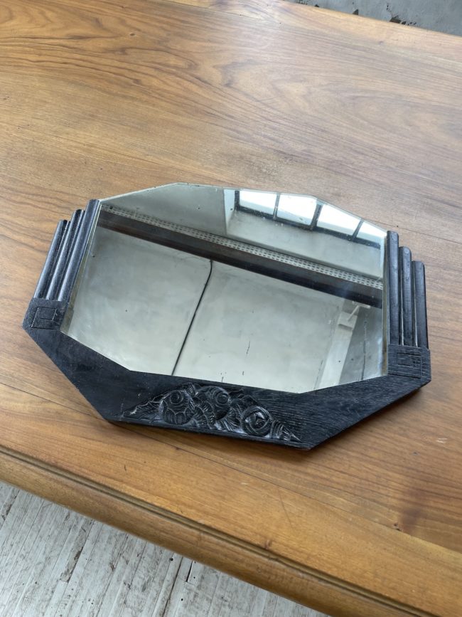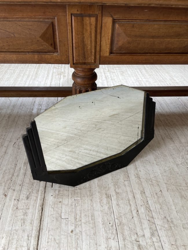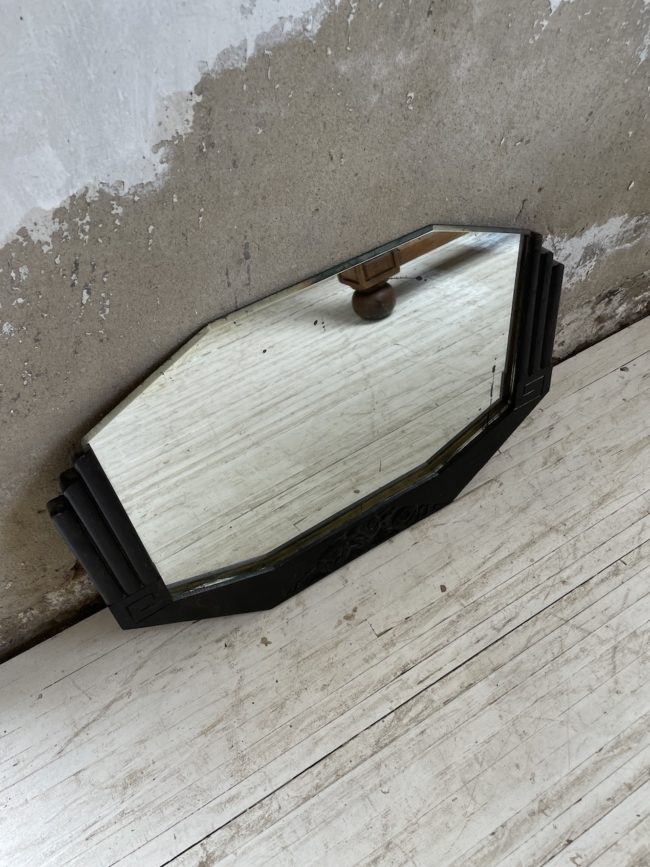 Ancien petit miroir style art déco, composé d’une structure en bois à motifs graphiques et motifs fleuris, le tout en laque noircie. Le miroir vient s’enficher dans la structure en bois. Le miroir est piqué par endroits, comme l’attestent les photos, ce qui en fait tout son charme et son authenticité.