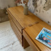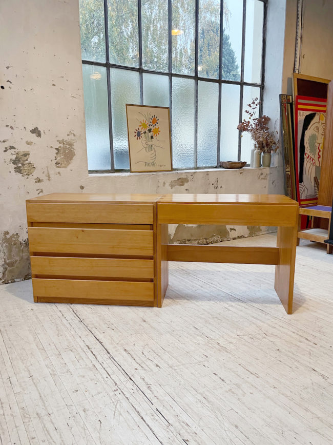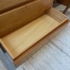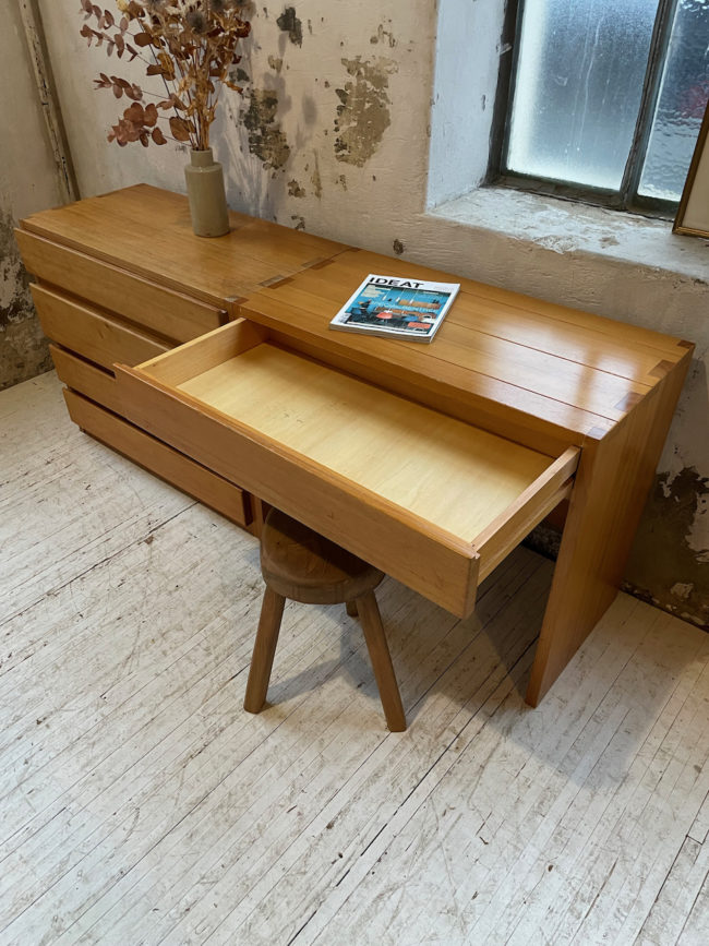 Quatre tiroirs permettent un rangement confortable, avec des hauteurs différentes. Très beau veinage et teinte du bois.